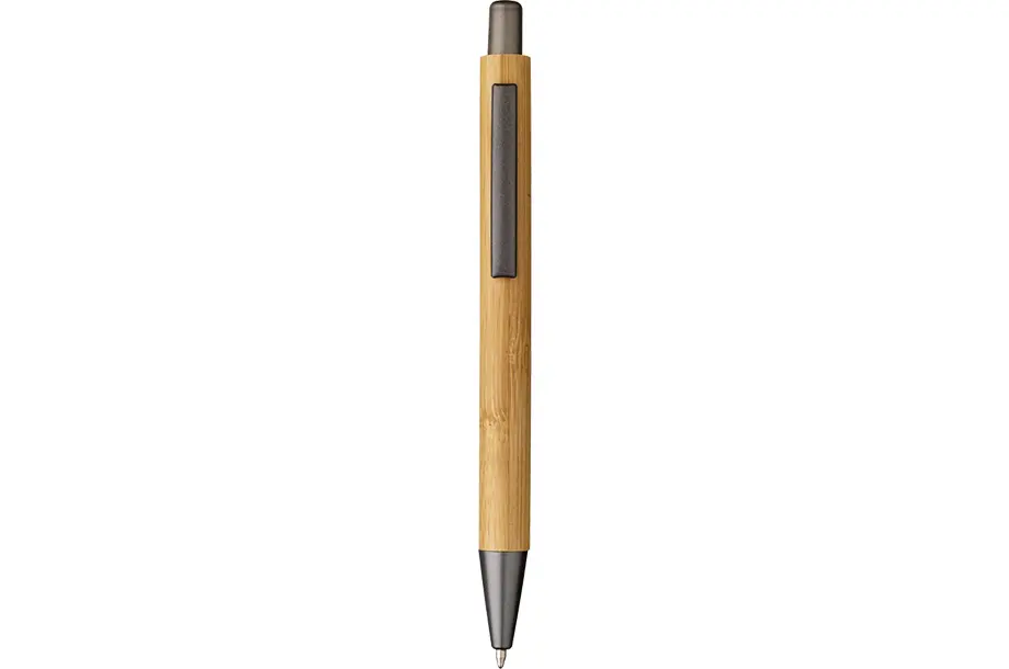 Ekologiczny długopis z niebieskim wkładem z pięknym bambusowym korpusem, końcówką z ABS, przyciskiem i metalowym klipsem.