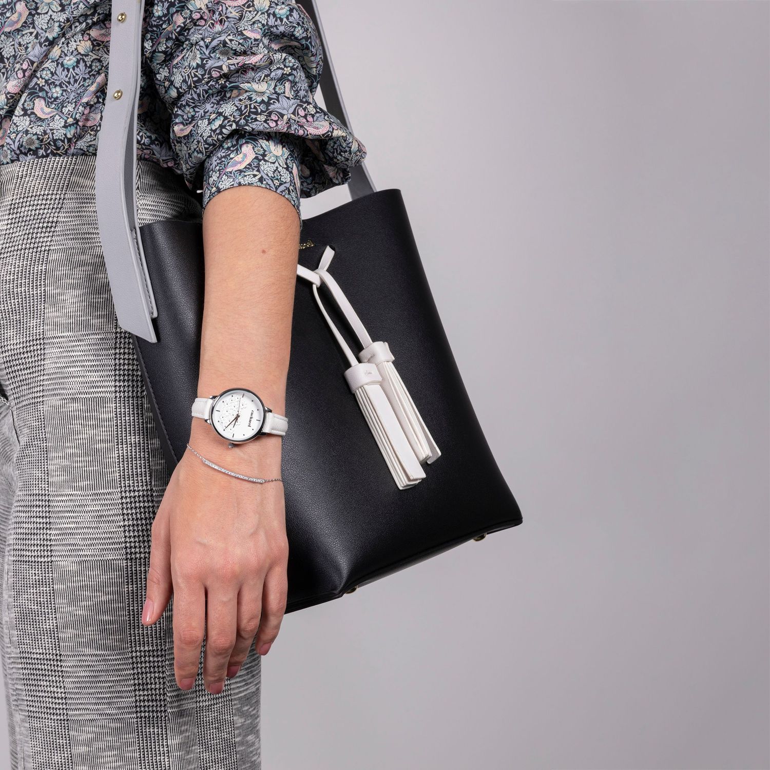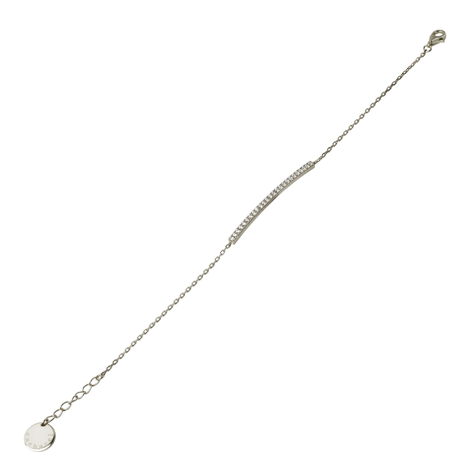 Ta elegancka bransoleta jest wykonana z delikatnego srebra i podkreślona brukowaną kryształową barietką. Ten srebrny dodatek jest minimalistyczny, ale olśniewający.