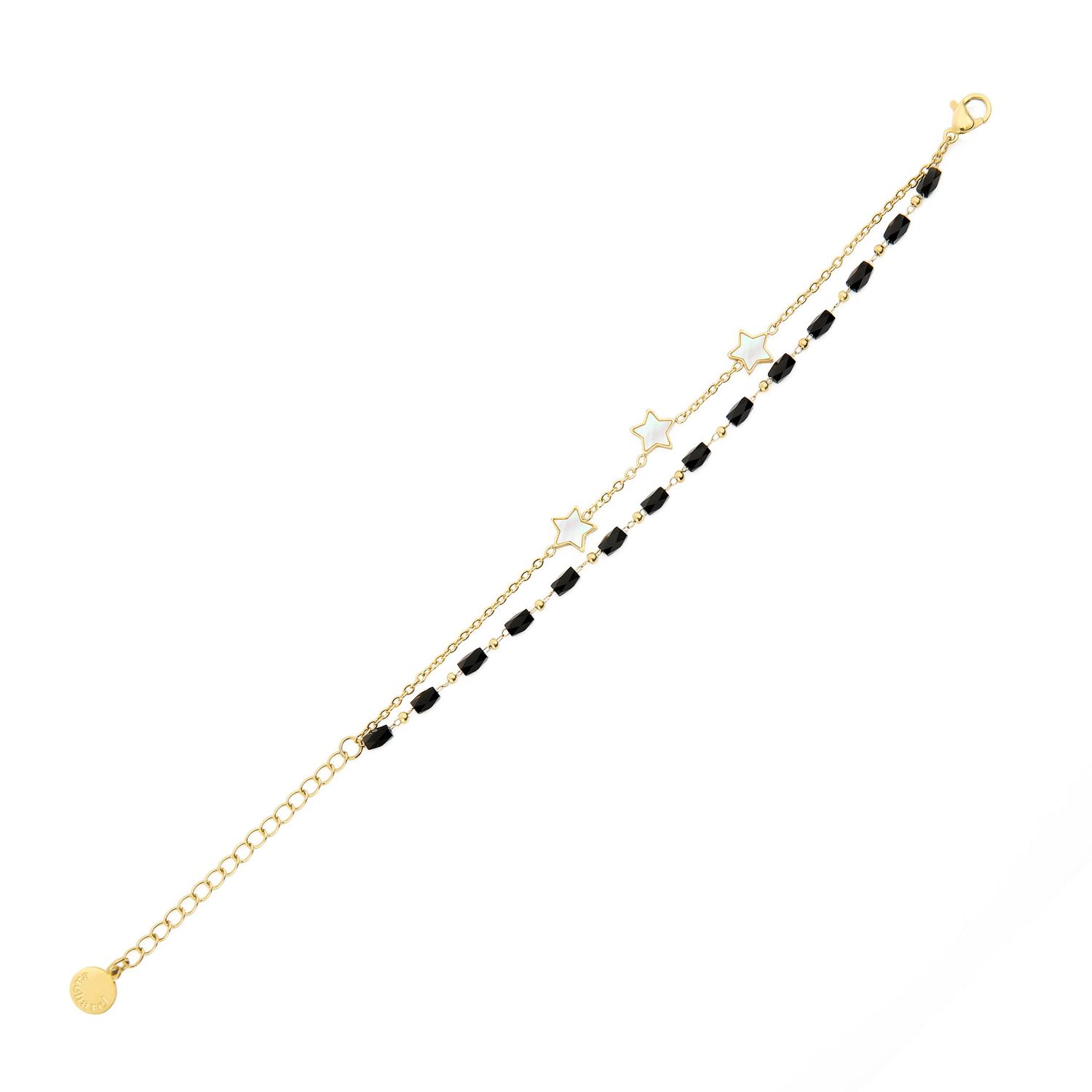 Bransoletka „Vivienne” w kolorze Gold & Black to zabawna i elegancka podwójna bransoletka trompe l’oeil, zawierająca mieszankę małych pereł i elementów gwiaździstych z wykończeniem masy perłowej. Podpisana na zamknięciu tabliczką z podpisem Cacharel, ta bransoletka emanuje wyraźnym urokiem. Wykonana ze stali nierdzewnej, jest wszechstronnym dodatkiem, który bez wysiłku dodaje odrobinę wyrafinowania do każdego stroju.