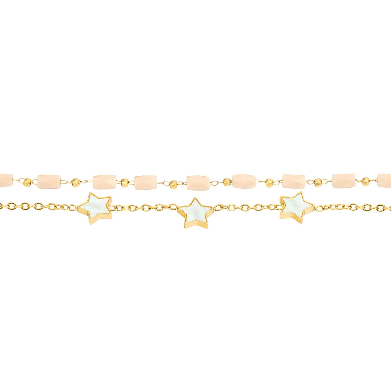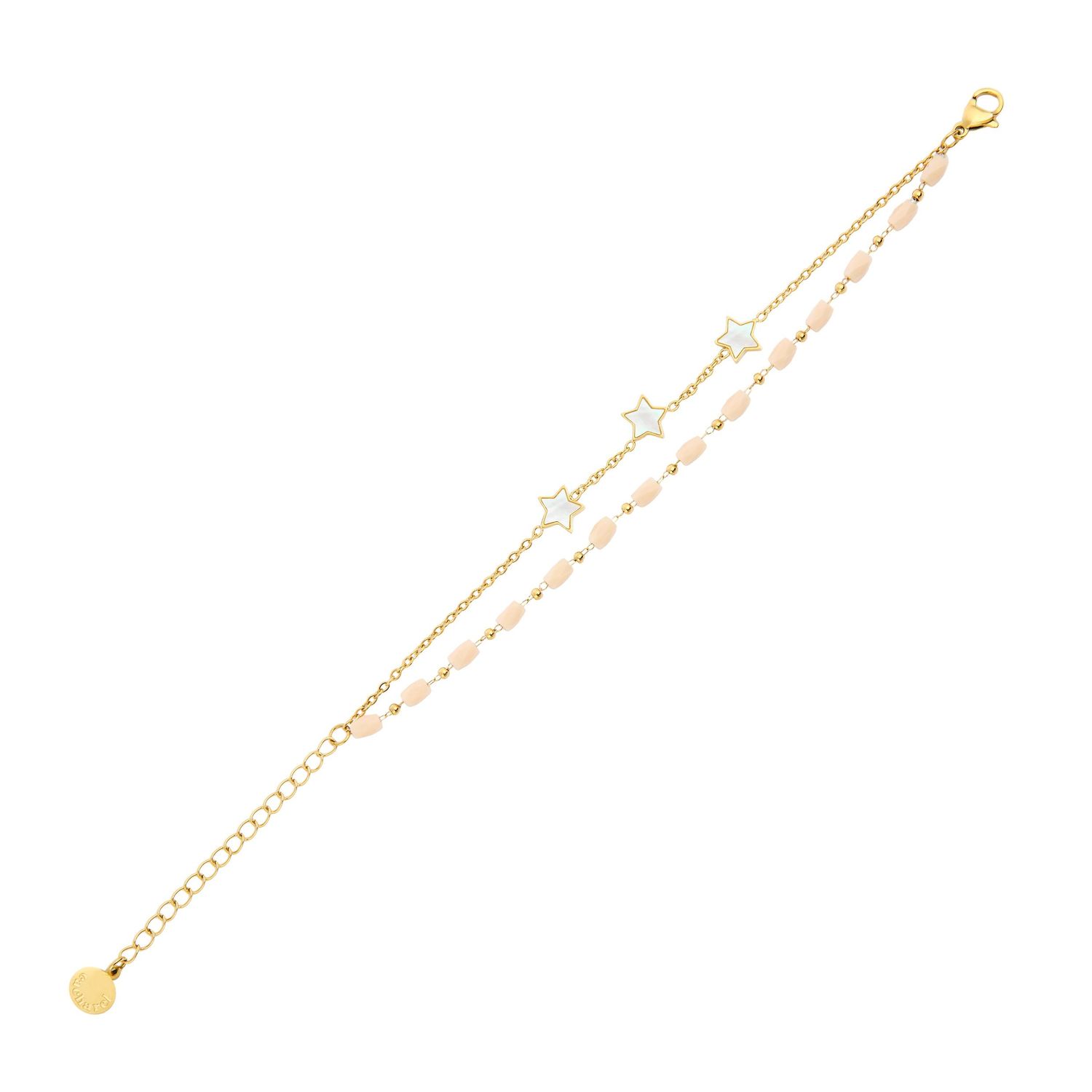 Bransoletka „Vivienne” w kolorze Gold & Nude to zabawna i elegancka podwójna bransoletka trompe l’oeil, zawierająca mieszankę małych pereł i elementów gwiaździstych z wykończeniem masy perłowej. Podpisana na zamknięciu tabliczką z podpisem Cacharel, ta bransoletka emanuje wyraźnym urokiem. Wykonana ze stali nierdzewnej, jest wszechstronnym dodatkiem, który bez wysiłku dodaje odrobinę wyrafinowania do każdego stroju.