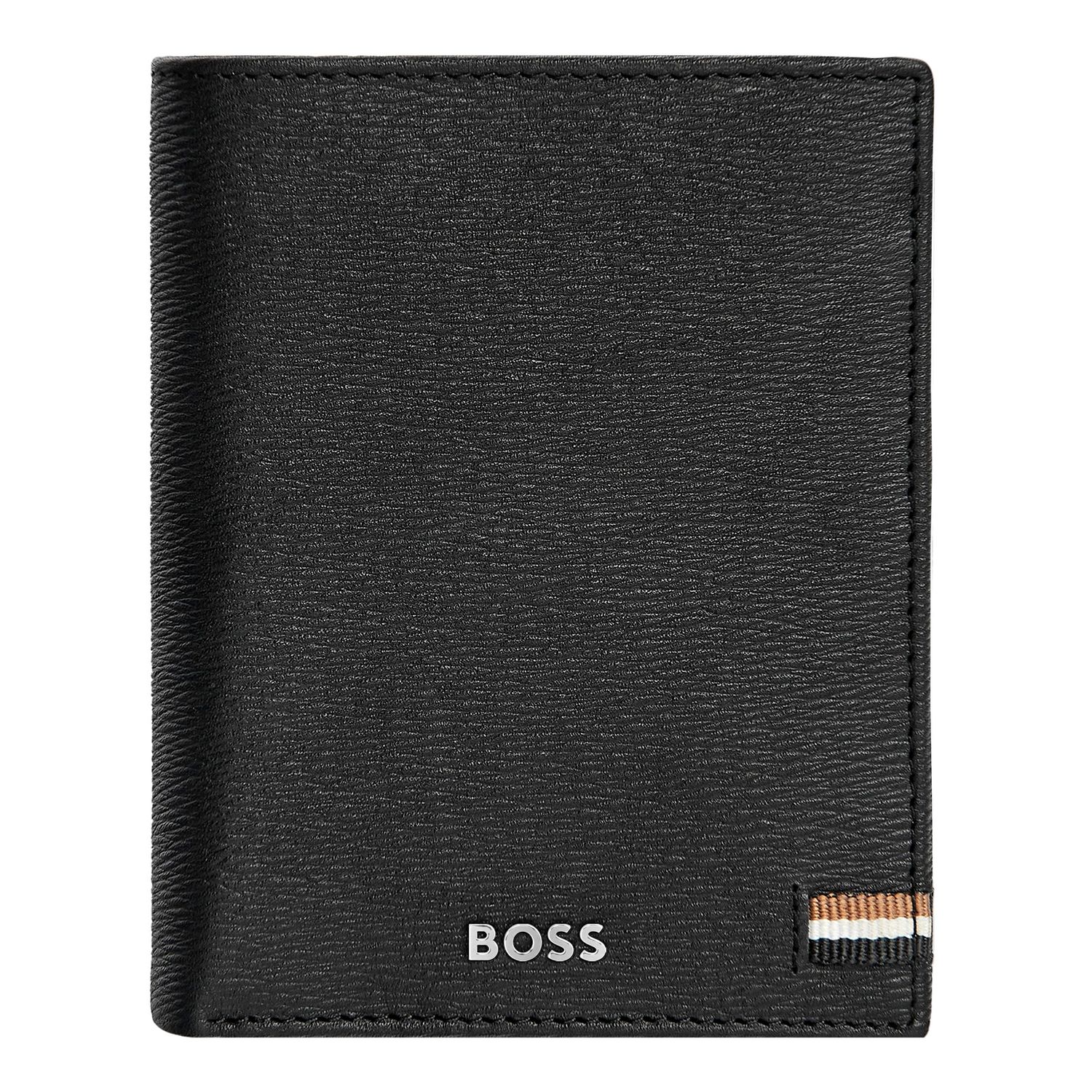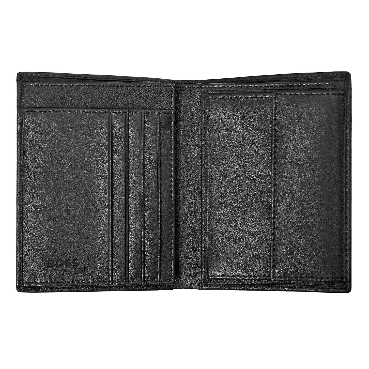 To etui na karty z klapką i saszetką na pieniądze jest wykonane ze starannie dobranej, teksturowanej czarnej skóry. Jest sygnowane luksusową chromowaną tabliczką z podpisem BOSS i posiada wewnętrzną podszewkę z monogramem. Ponadto linia Iconic zawiera kultową trójkolorową flagę BOSS. Posiada : 2 przegrody na banknoty 12 miejsc na karty 5 przegródek bocznych 1 miejsce na monety Zgodnie z DNA marki BOSS, jest prosty, funkcjonalny, elegancki i minimalistyczny.