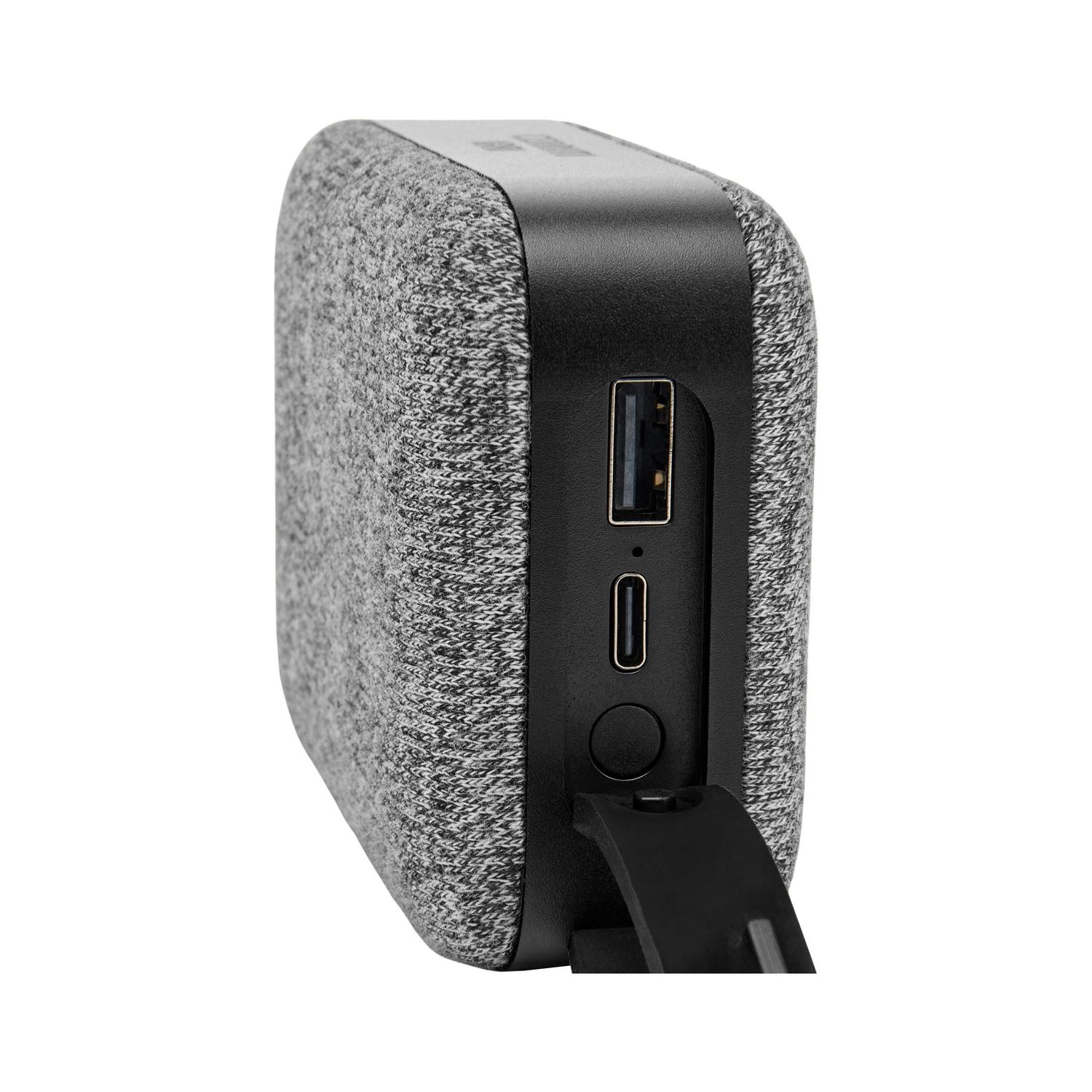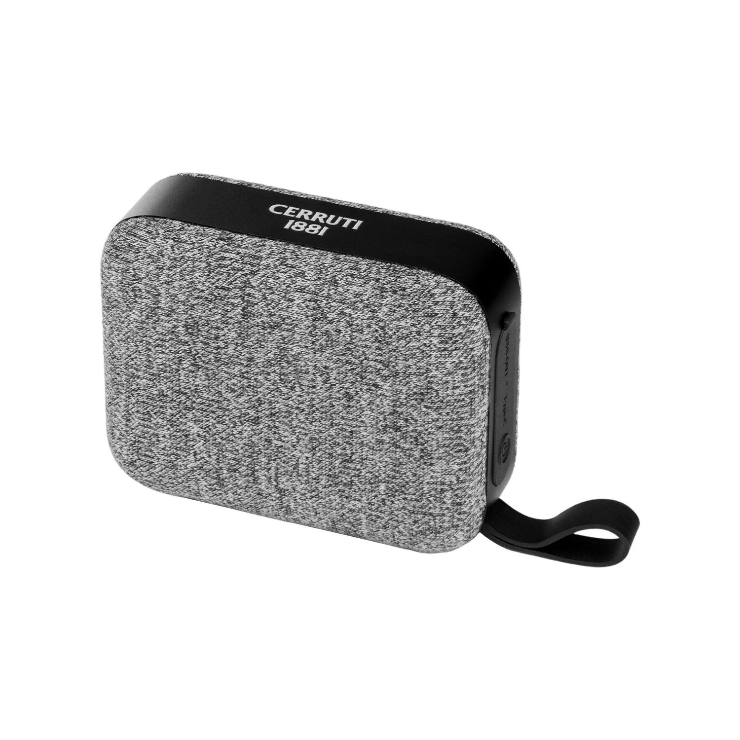 Chic and minimal, the Jefferson portable speaker is designed to be carried everywhere, signed with the new CERRUTI 1881 logo and crafted with a matte black recycled aluminium frame paired with a grey mélange Jaspe fabric, a signature of the CERRUTI 1881 fashion house. It delivers a clear 5W output, charges via USB-C, and features a 4000 mAh battery that sustains extended listening while also functioning as a practical portable charger. A refined everyday companion, it blends modern utility with an effortless touch of CERRUTI style.