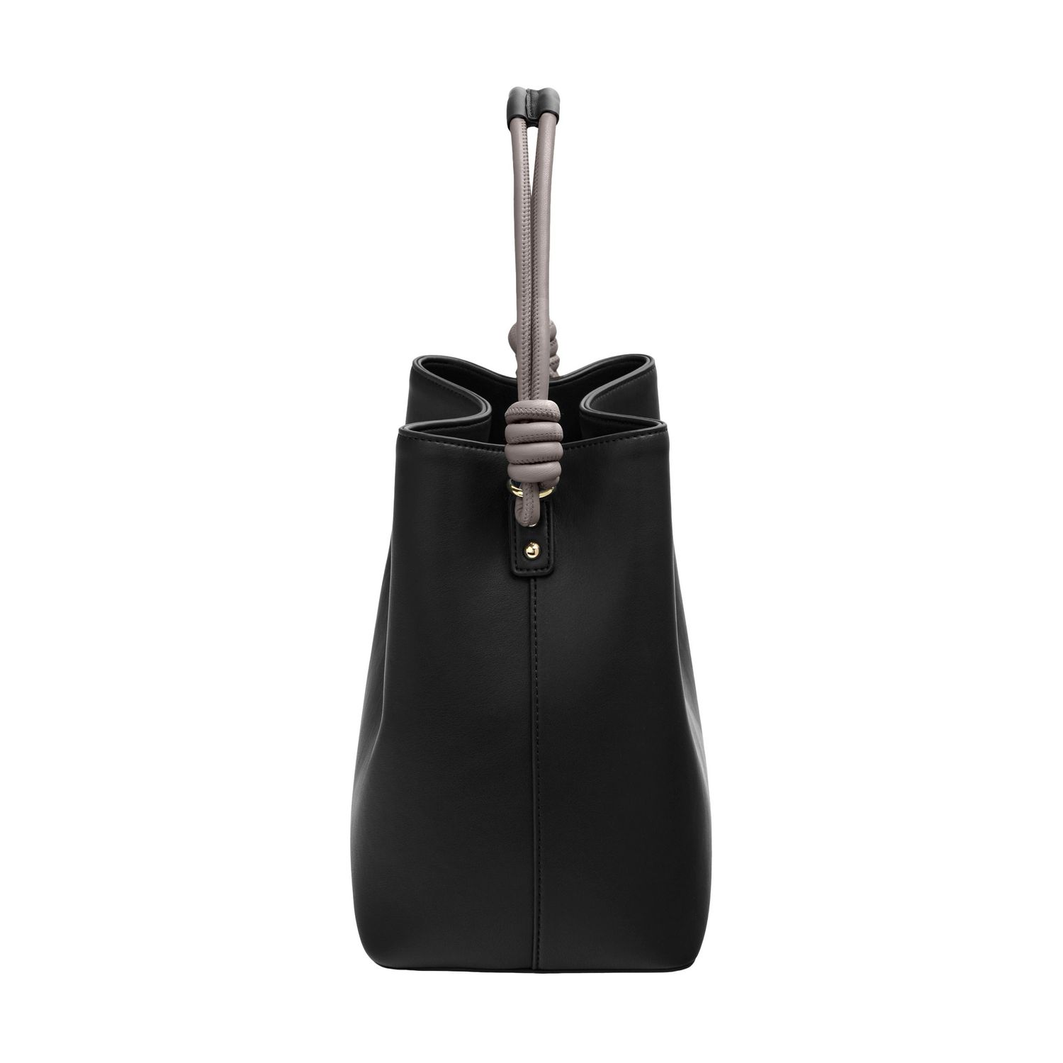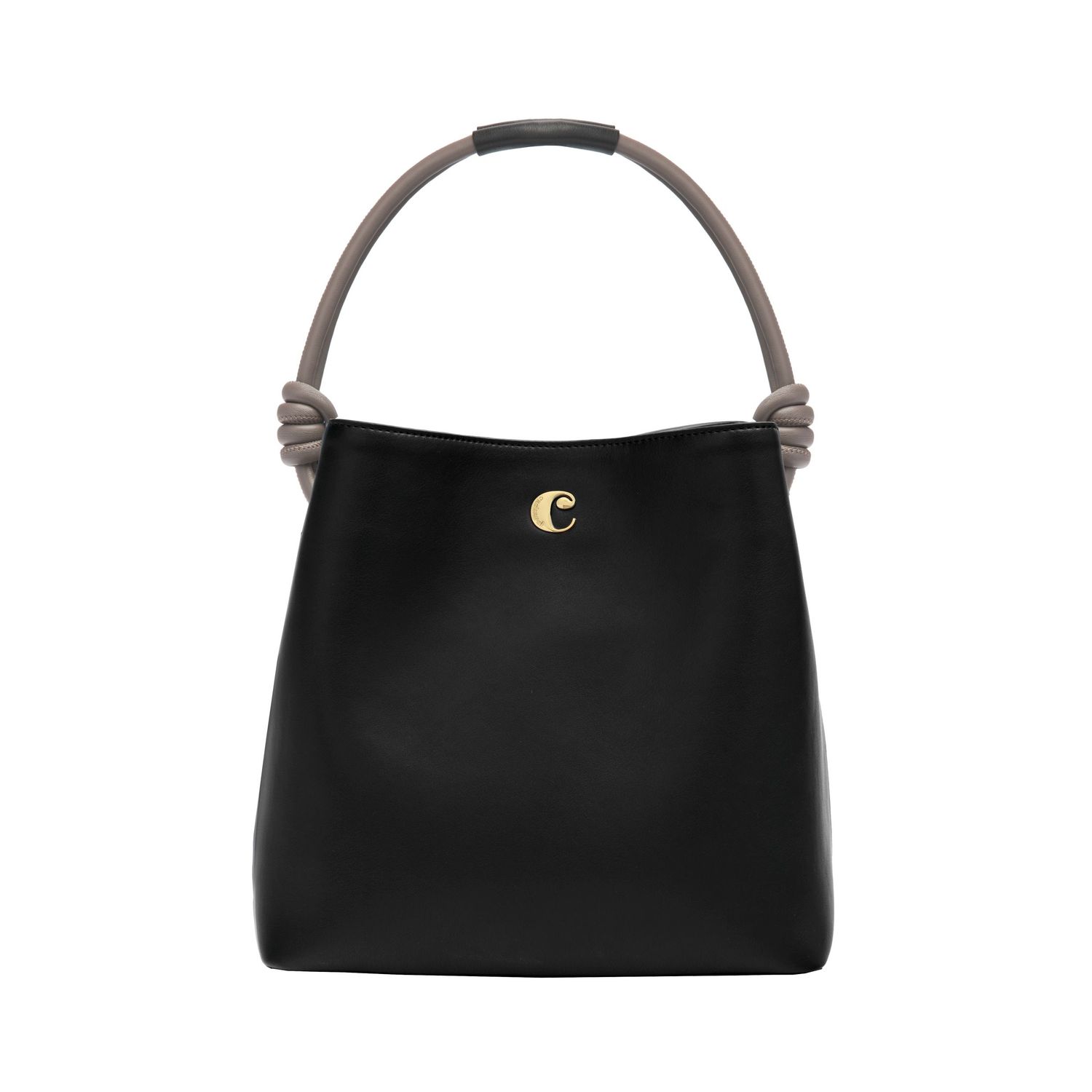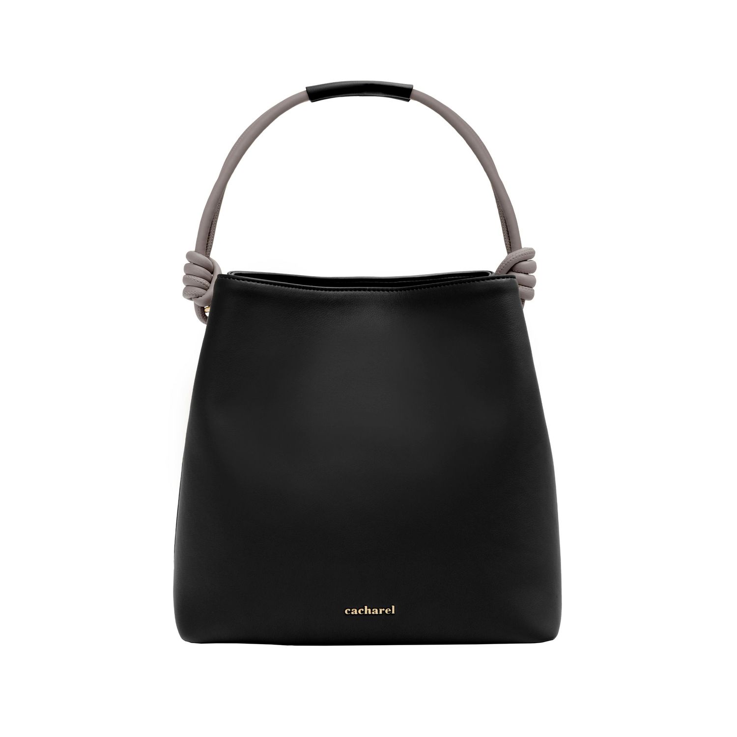 Czarna torba Apolline marki Cacharel wykonana jest z miękkiej, matowej, wysokiej jakości skóry wegańskiej (PU) i ma odważny design z kultowym logo „C” z przodu. Torba jest zaakcentowana uchwytem w kształcie węzła w kolorze ciemnoszarym, dodając charakterystyczny akcent do eleganckiej czarnej podstawy. Wszystkie wykończenia, w tym charakterystyczne logo „C” z przodu, są lekko pozłacane, co dodaje elegancji. Dodatkowo z tyłu znajduje się złoty podpis TPU Cacharel. Czarna torba Apolline oferuje funkcjonalne, a jednocześnie stylowe rozwiązanie do codziennego użytku, z przestronnym wnętrzem i wszechstronnym designem. Linia jest miękka, kolorowa i zabawna, bez wysiłku łącząc elegancję z nowoczesnym urokiem.