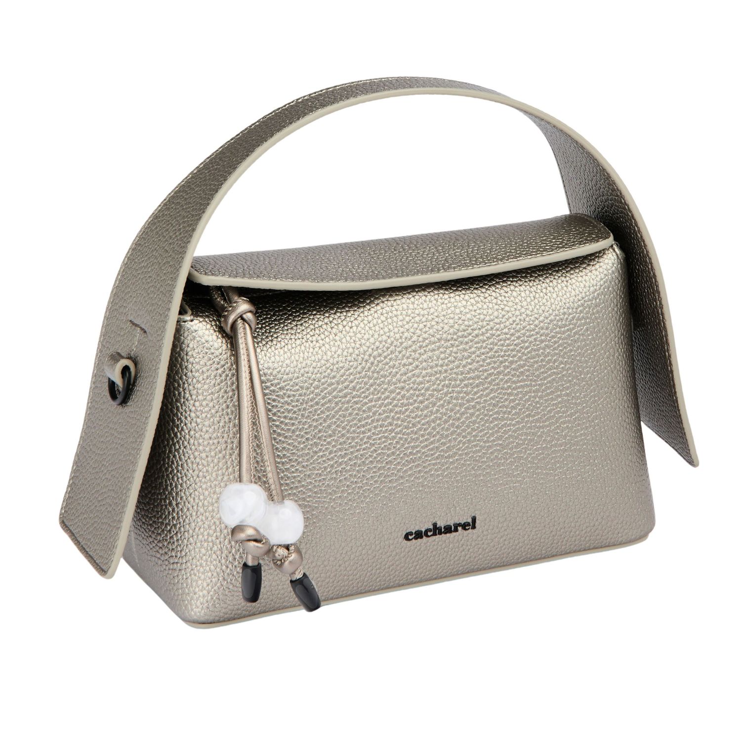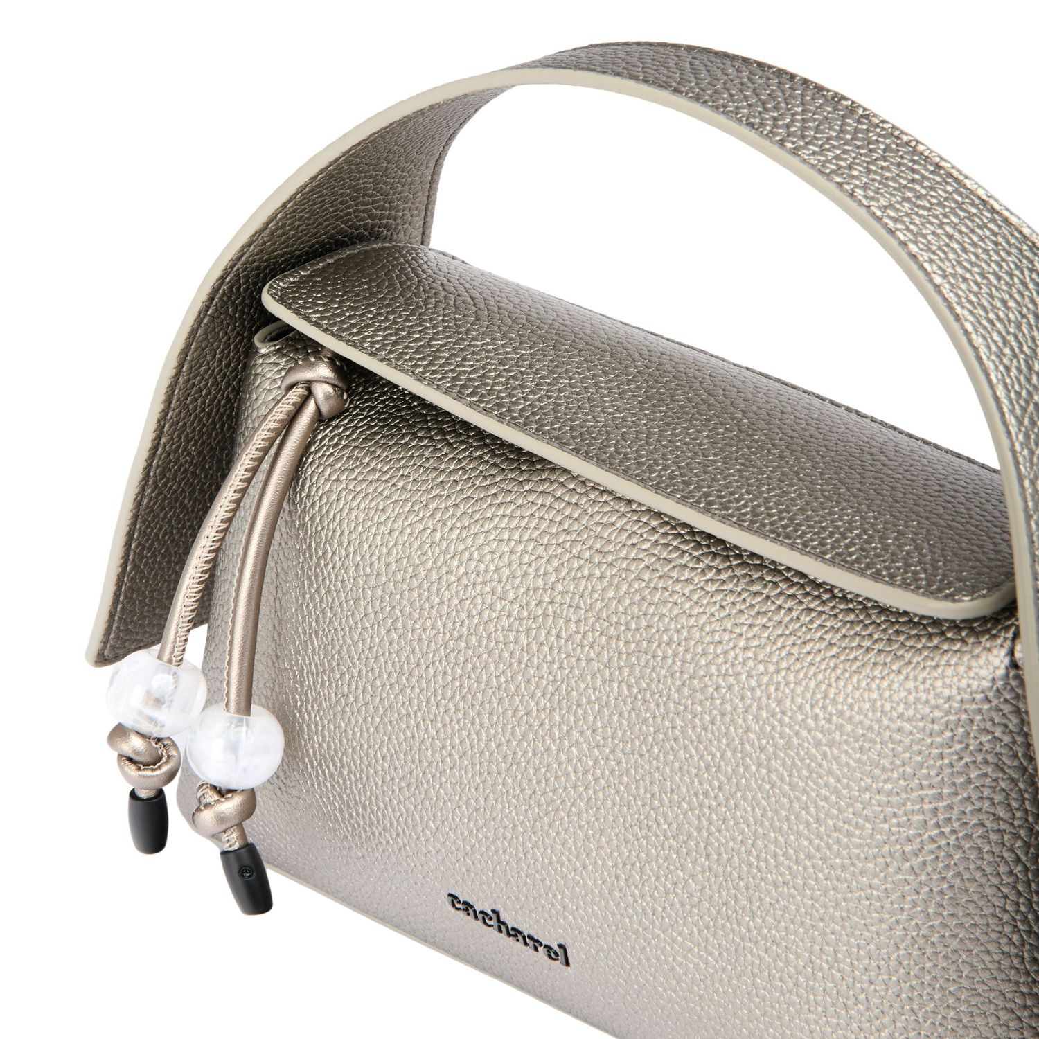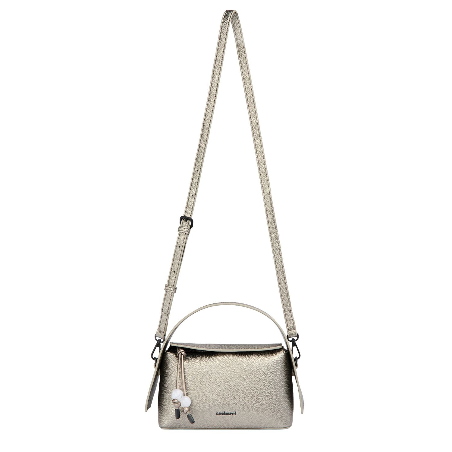 Torebka „Clementine” z metalizowanej brązowej skóry wegańskiej (PU) ma nowoczesny, współczesny design z eleganckim, ziarnistym matowym wykończeniem. Czarne, matowe metalowe akcenty wnoszą dodatkowy powiew nowoczesności. Uderzający metalizowany materiał podkreśla zintegrowaną, nowoczesną sylwetkę, a nieoczekiwana konstrukcja uchwytu zapewnia charakterystyczny akcent. Sygnowana kultowym logo „Cacharel” z przodu i tabliczką „C” z tyłu, torba łączy funkcjonalność z zdecydowanym stylem. Nowoczesny, ostry design i odważny kolor sprawiają, że jest to wyróżniający się dodatek.
