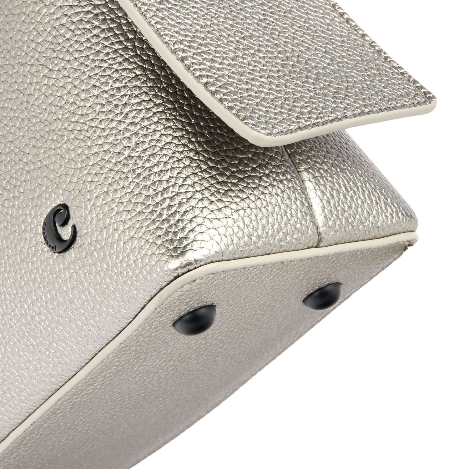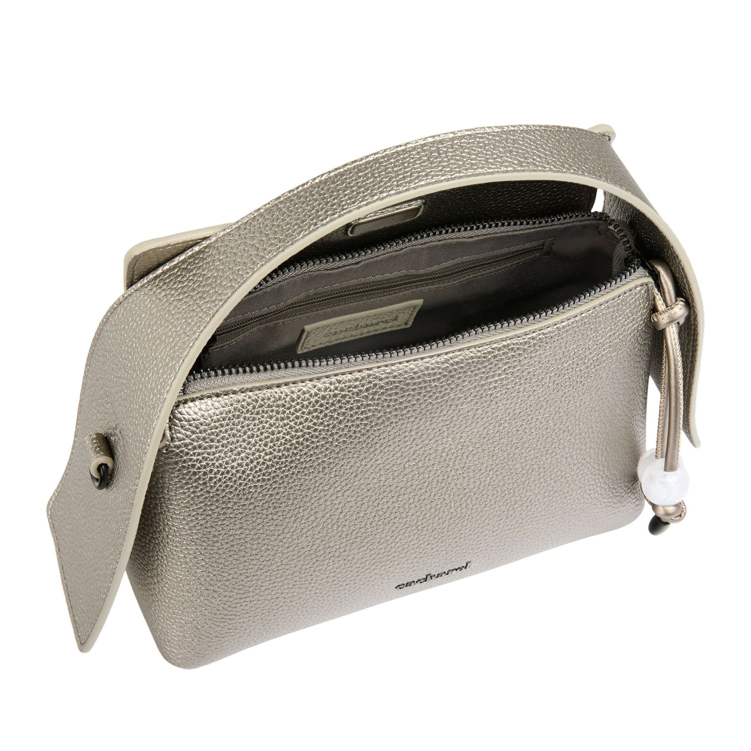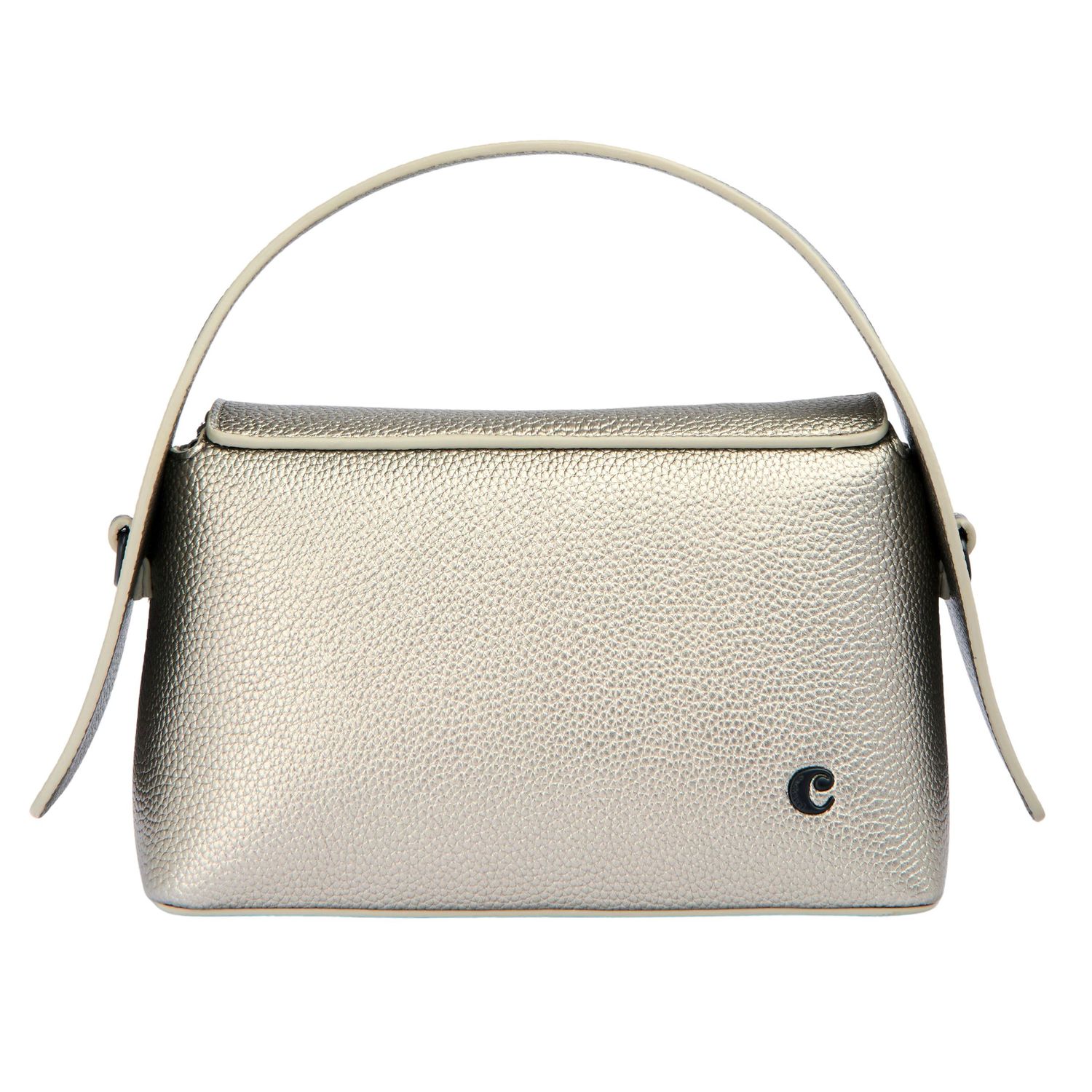 Torebka „Clementine” z metalizowanej brązowej skóry wegańskiej (PU) ma nowoczesny, współczesny design z eleganckim, ziarnistym matowym wykończeniem. Czarne, matowe metalowe akcenty wnoszą dodatkowy powiew nowoczesności. Uderzający metalizowany materiał podkreśla zintegrowaną, nowoczesną sylwetkę, a nieoczekiwana konstrukcja uchwytu zapewnia charakterystyczny akcent. Sygnowana kultowym logo „Cacharel” z przodu i tabliczką „C” z tyłu, torba łączy funkcjonalność z zdecydowanym stylem. Nowoczesny, ostry design i odważny kolor sprawiają, że jest to wyróżniający się dodatek.