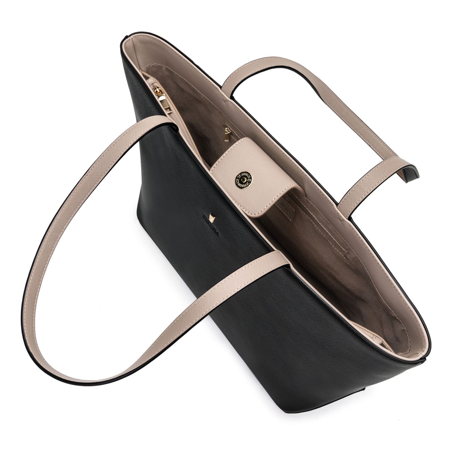 Sławna linia „Mademoiselle” Festiny jest uzupełniona w tym sezonie o nową ofertę torebek damskich. Ta duża torba wykonana jest z pięknie teksturowanej skóry wegańskiej (PU) saffiano. Każdy detal jest delikatnie wykonany, tak jak ikoniczna złota płytka z podpisem F, obecna w całej kolekcji i podkreślona pięknie wytłoczonym logo FESTINA. Pięknie zaprojektowany produkt posiada kolorowe, skontrastowane i bardzo praktyczne wnętrza, różane wnętrza. Ta konkretna torba posiada magnetyczne zamknięcie na guzik oraz bardzo dużą wewnętrzną komorę zapinaną na zamek błyskawiczny, idealną na laptopa i inne cenne przedmioty. Posiada również inną płaską kieszeń oraz płaską kieszeń zapinaną na zamek, idealną do organizacji dokumentów i innych niezbędnych rzeczy. Wersja czarna ma kontrastujące beżowe wnętrze, pasujące do tytułowego portfela.