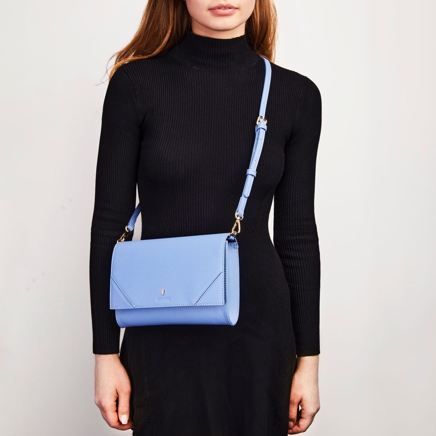 Sławna linia „Mademoiselle” Festiny jest uzupełniona w tym sezonie o nową ofertę torebek damskich. Ta torebka crossbody wykonana jest z pięknie teksturowanej skóry wegańskiej saffiano (PU). Każdy detal jest delikatnie wykonany, tak jak ikoniczna złota płytka z podpisem F, obecna w całej kolekcji i podkreślona pięknie wytłoczonym logo FESTINA. Pięknie zaprojektowane, posiadają kolorowe, kontrastowe i bardzo praktyczne wnętrza, królewskie, a jednocześnie kompaktowe z zapinaną na zamek komorą, w której można zorganizować wszystkie niezbędne rzeczy. Ta jasnoniebieska wersja ma kontrastowe, granatowe wnętrze. Pasek ma regulowaną długość.