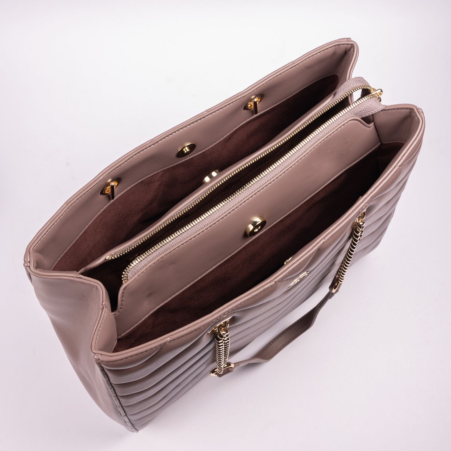 Torba „Odeon” jest elegancka i stonowana, a jej pikowany wzór został wykonany na pięknej, lekko fakturowanej skórze wegańskiej (PU). Tabliczka z podpisem jest nieco powiększoną i wypukłą wersją kultowego logo „C”, sygnowaną grawerunkiem Cacharel. Suwak jest również sygnowany kultowym logo „C” i wykonany z pięknego pozłacanego metalu połączonego z wegańską skórą, co nadaje całości piękny, kobiecy charakter. Ta torba jest idealną modną torbą, która będzie Ci towarzyszyć w ciągu dnia w pracy. Posiada 3 oddzielne przegrody, z których jedna jest zapinana na zamek. Idealna, aby zorganizować wszystkie swoje pliki, laptopa i inne codzienne niezbędne rzeczy.