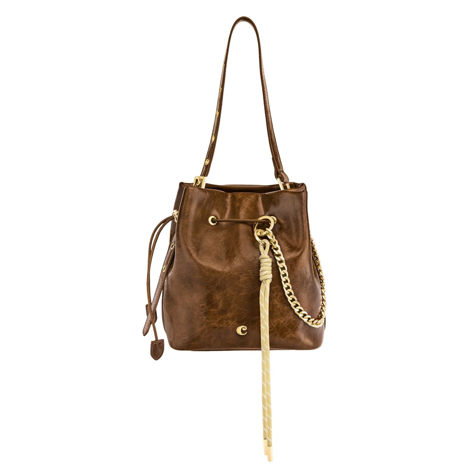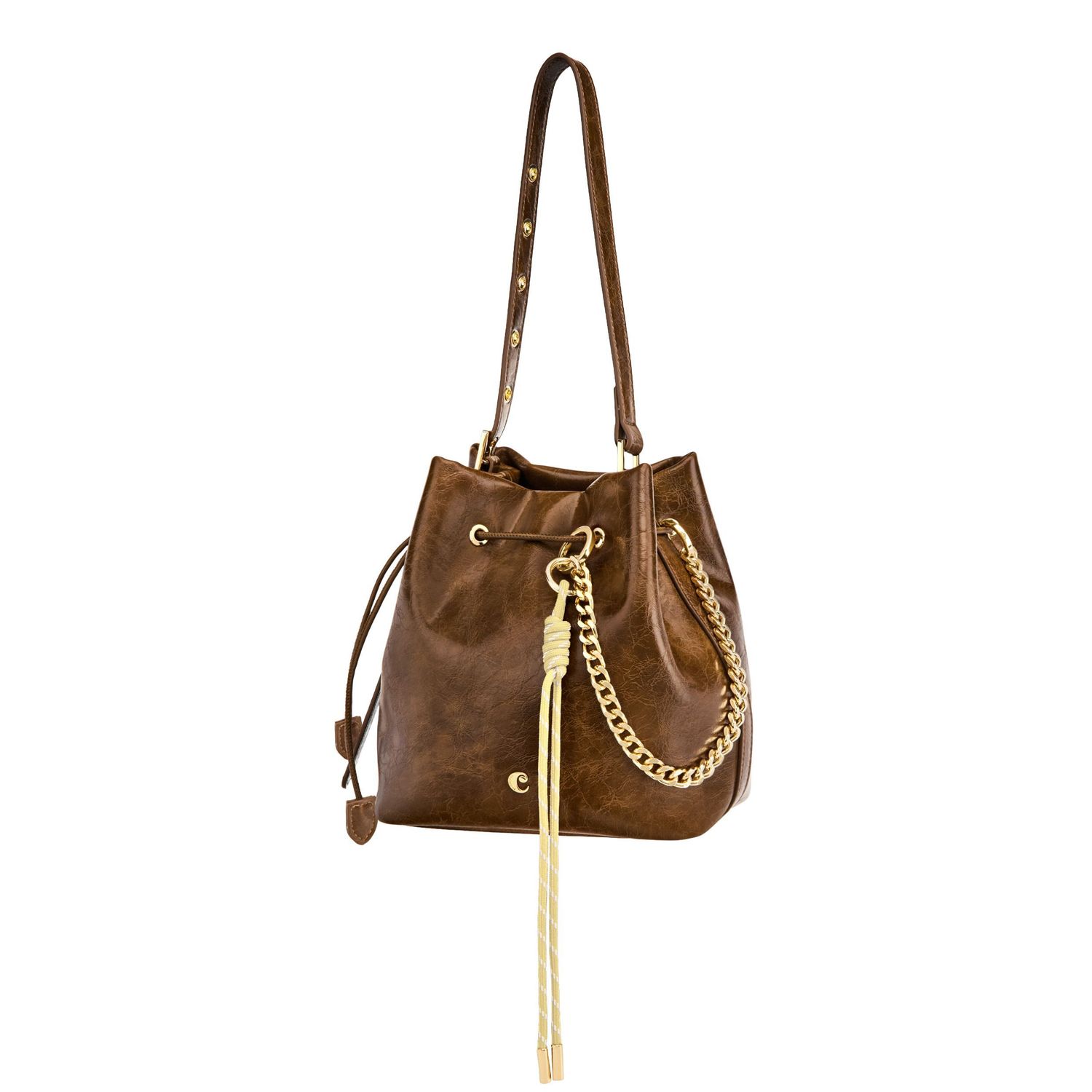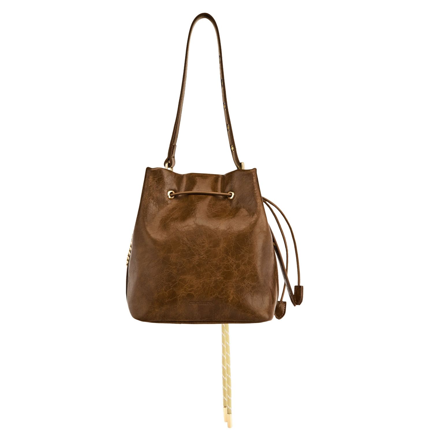 The Philomene bucket bag blends timeless elegance with a bold, fashion-forward attitude. Crafted from a glazed, crinkled leather-like texture, it is signed with the signature Cacharel C plate, enhanced by refined gold trims, and finished with a discreet embossed Cacharel logo. The material is soft, supple, and remarkably luxurious to the touch. Its adjustable strap allows for both hand and shoulder carrying, while an additional strap transforms it into a crossbody bag. A PU cord closure reinforces its pouch-like shape, and a removable decorative cord-and-chain charm adds a distinctive, stylish accent. Compact yet spacious, its interior offers ample room for essentials and includes a zipped pocket for added convenience. Available in black, burgundy, and camel.