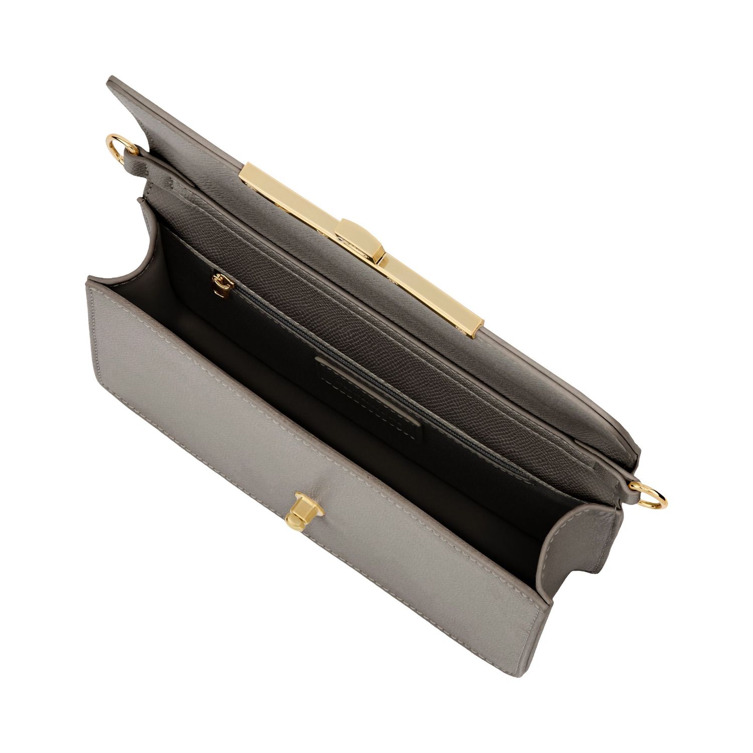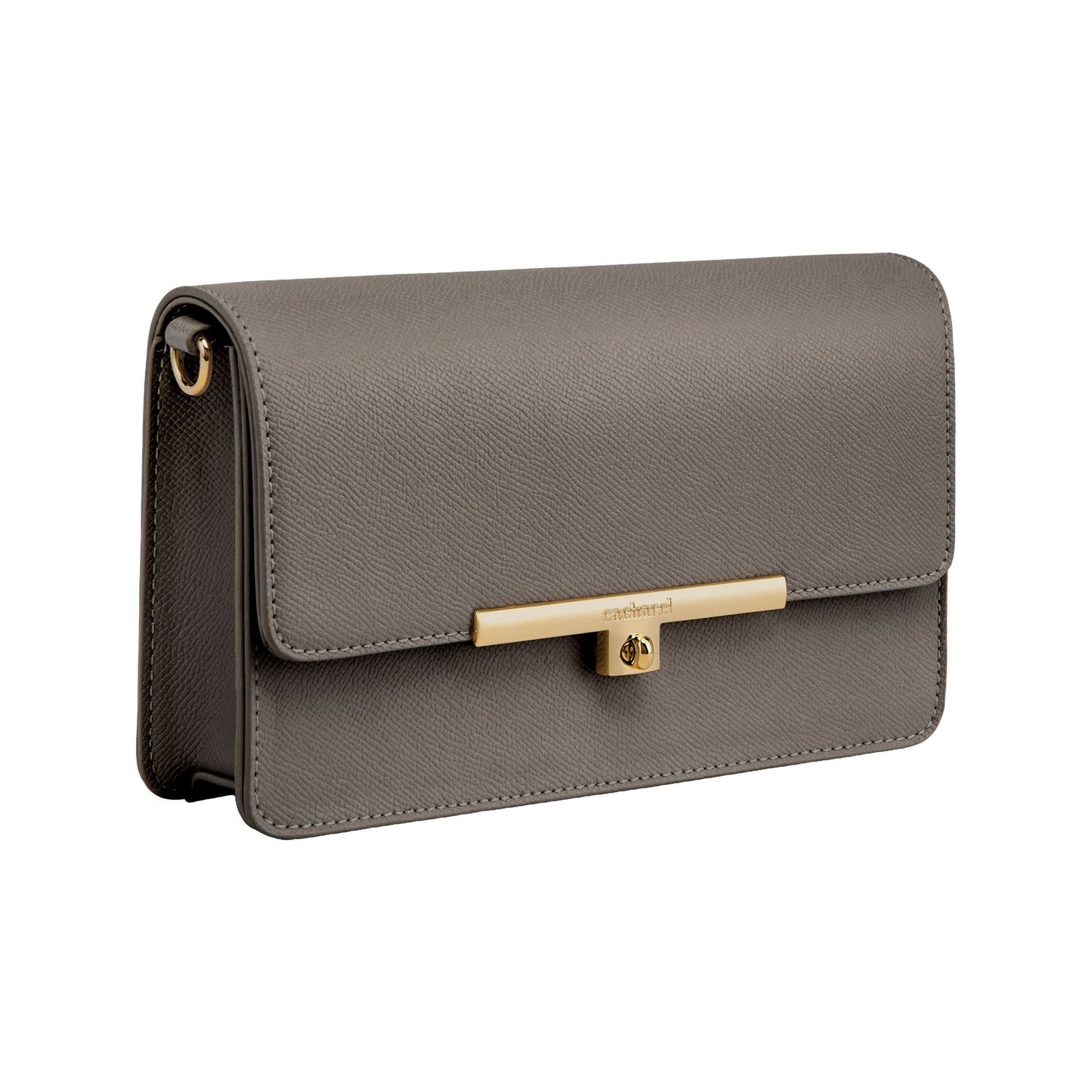 The Seraphine crossbody bag embodies refined elegance through its minimal, contemporary design. Crafted from saffiano-textured vegan leather, it is signed with an exclusive gold turn-lock closure engraved with the Cacharel logo, conveying a sense of luxurious simplicity. All gold trims bring a feminine and refined accent, while the discreet gold TPU logo on the back adds a subtle signature touch. Delivered with an adjustable and removable strap, the bag can be worn as a clutch, shoulder, or crossbody style. Its interior features a zipped compartment, offering both practicality and sophistication. Available in taupe, light grey, and black.