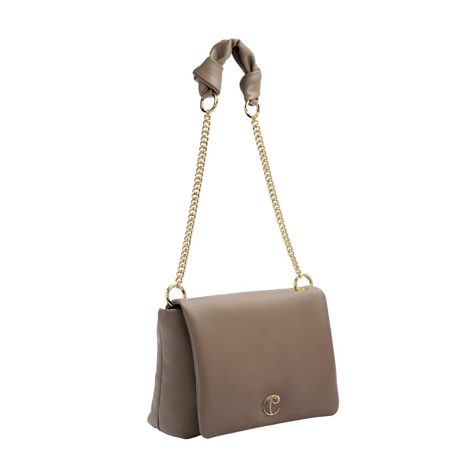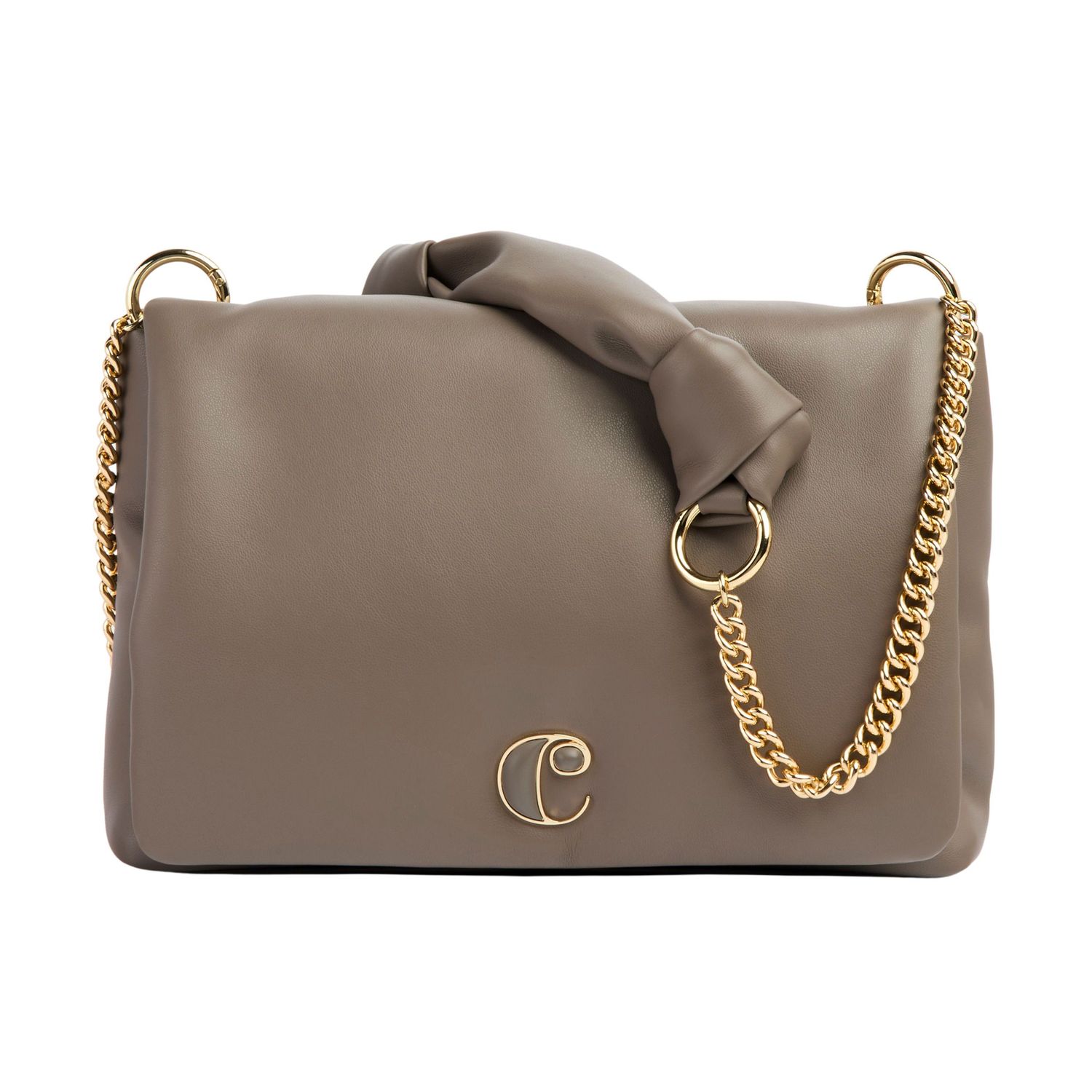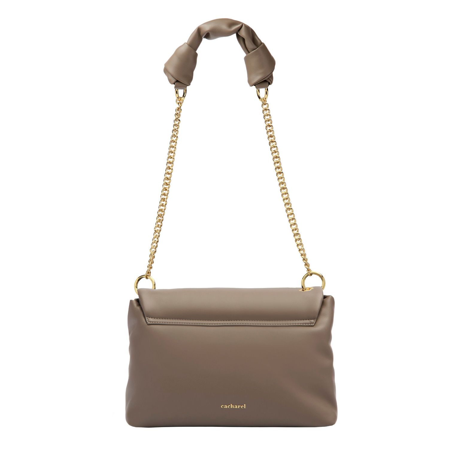 Torebka „Vivienne” w kolorze taupe to idealne połączenie miękkości i uroku, wykonane z wysokiej jakości, miękkiej, matowej skóry wegańskiej (PU) z efektem wyściełania, który podkreśla jej wyrafinowaną sylwetkę. Złote akcenty wnoszą ciepło i luksus do projektu, a złota tabliczka z logo „C” z wykończeniem ABS w kolorze taupe płynnie dopasowuje się do korpusu torby, zapewniając dopracowany i spójny wygląd. Ta wersja posiada charakterystyczny pasek z elegancką kokardą i łańcuszkiem, oferując zabawny, ale wyrafinowany element. Subtelne logo Cacharel dopełnia jej ponadczasowy urok, a przestronne wnętrze sprawia, że idealnie nadaje się do codziennego użytku, łącząc praktyczność z elegancką estetyką.