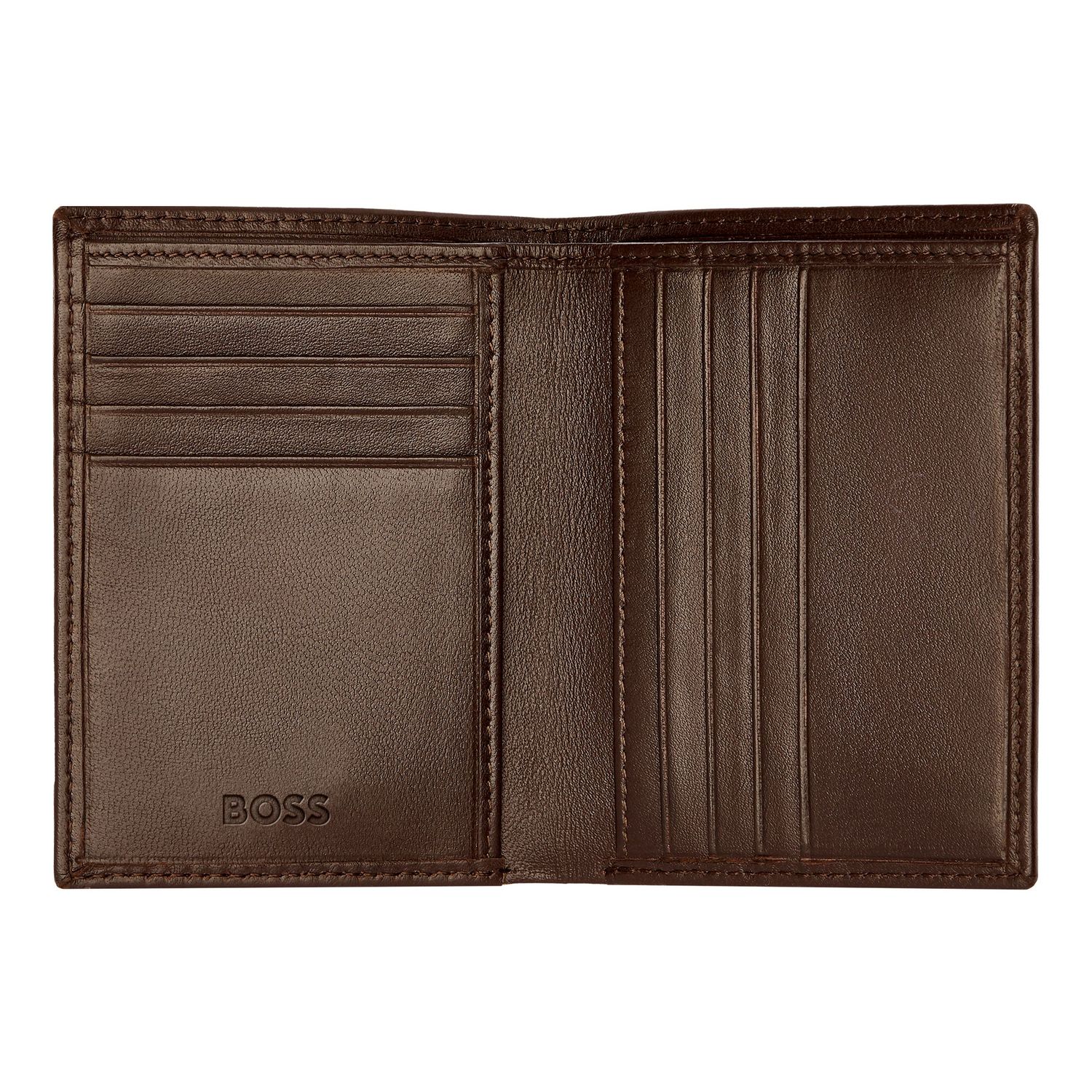 The Boss Classic Smooth line is Boss ultimate minimalist, timeless small leather goods offering, characterized by carefully chosen leathers and understated aesthetics. All pieces are masterfully crafted and signed with crisp chrome Brand plates, along with monogram linings. The designs are available in black and brown. This Compact card holder includes : 2 currency compartments 8 card slots 2 side compartments