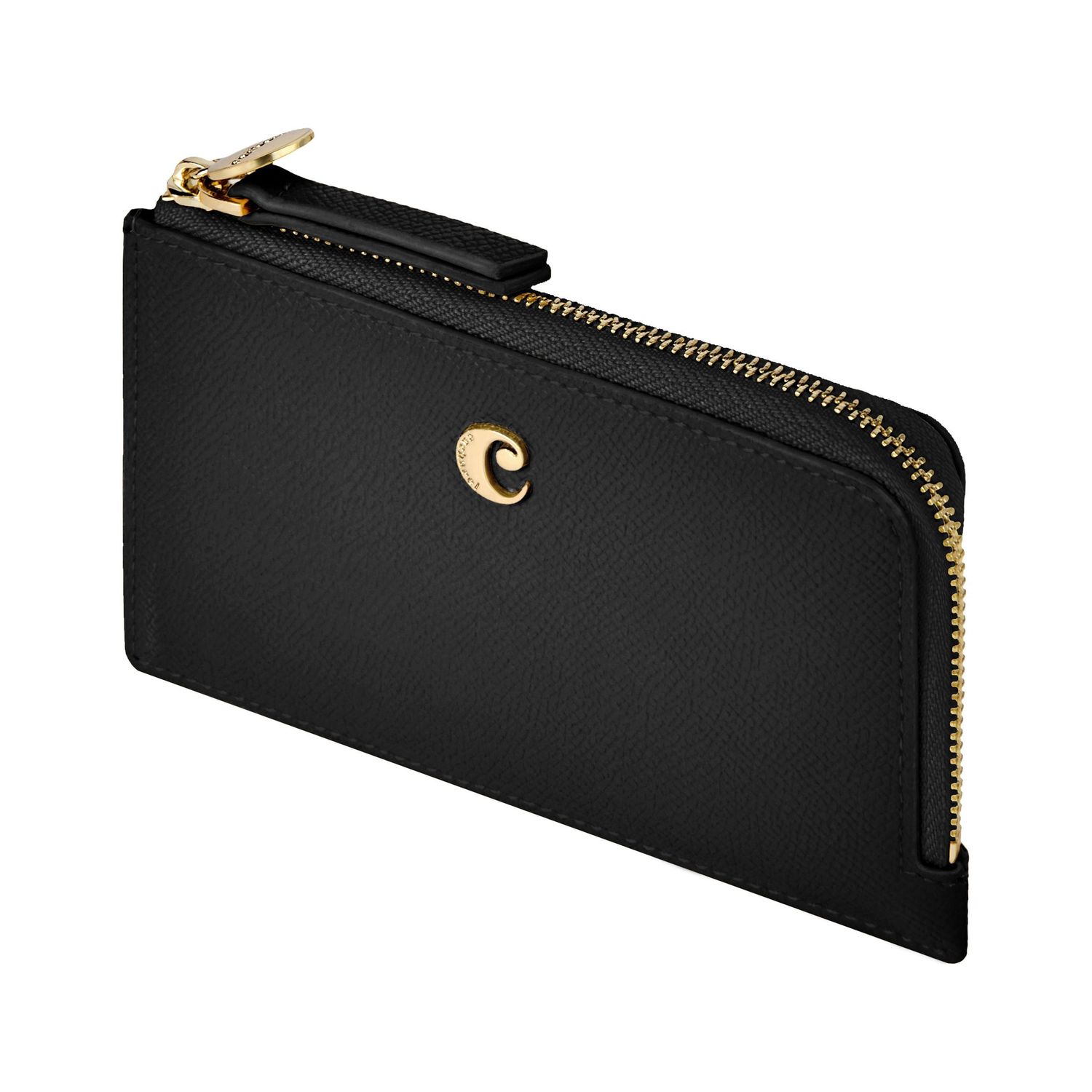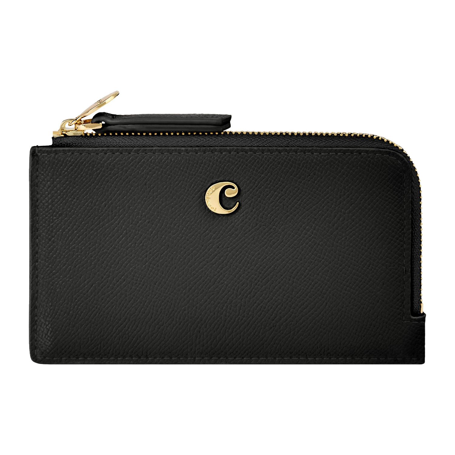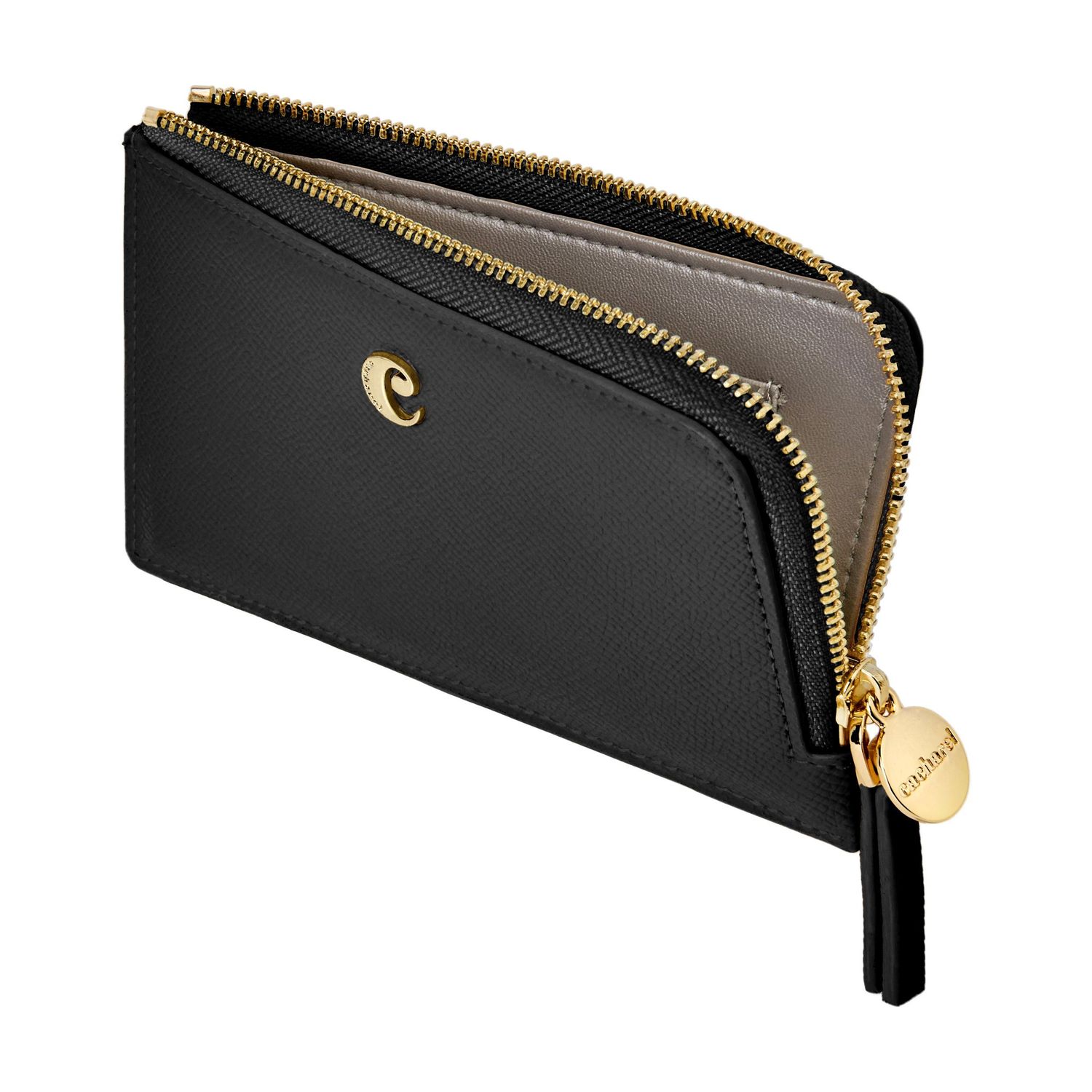 The Seraphine card holder combines practicality with a touch of playful elegance. This long zipped design is crafted from beautiful saffiano-textured vegan leather with a luxurious matte finish. It is signed with a gold-toned C plate on the front and completed by a refined metal plate on the zipper puller. Its spacious main compartment allows for easy organization, complemented by one inner card slot and five additional card slots on the back. A functional yet stylish everyday essential. This black version features a contrastive Taupe lining adding a touch of playfulness to this accessory.