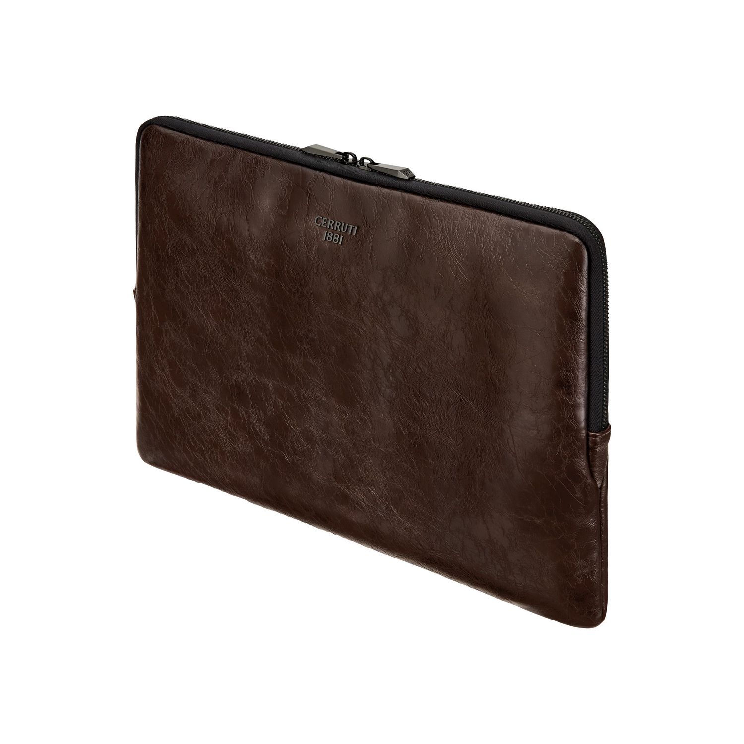 Part of our most fashion-forward line, the Hudson laptop pouch is defined by beautifully textured, vintage-inspired surfaces in the deepest chocolate hue, luxuriously finished with gunmetal accents, from the Cerruti 1881 signature to the newly developed RR zippers. Its minimal and modern shape creates a striking contrast with the aged material finish, expressing a refined dialogue between contemporary design and retro inspiration. The interior is fully monogrammed in a tone-on-tone execution, reinforcing its understated luxury. Luxurious, minimal and fashion-forward with a subtle retro nod, it is designed to protect and elevate everyday essentials.