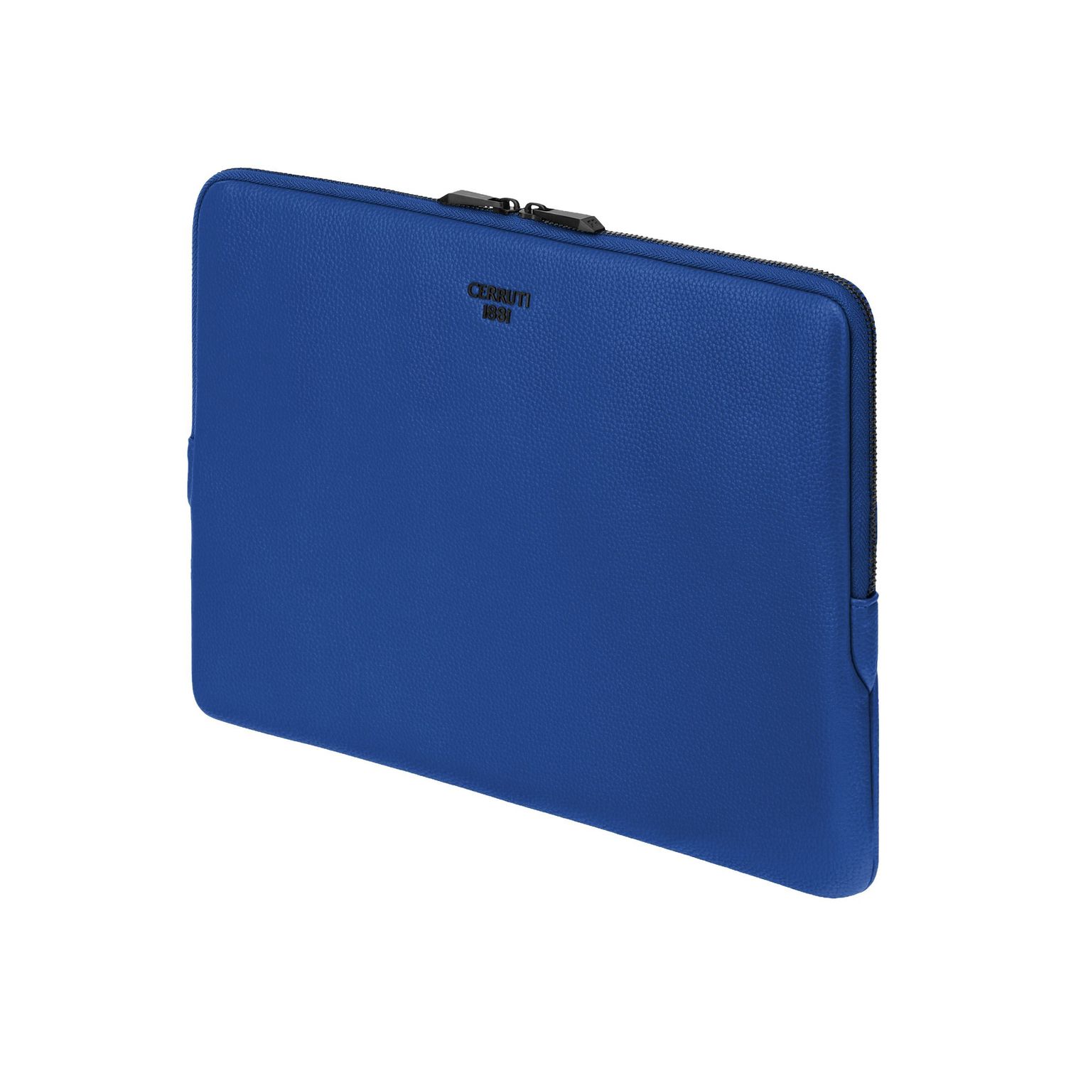 The Jefferson computer pouch in bright blue with matte black trims delivers a fashion-forward attitude while remaining an essential, functional everyday accessory. Compact and protective, it is crafted from a carefully selected matte-grained texture that brings a contemporary vibrancy to the minimal silhouette. Matte black metal accents—including the new Cerruti 1881 plate and angular signature zipper pullers engraved with RR—create a striking contrast and a distinctive finishing detail. With its monogramed lining and beautifully executed simplicity, the piece stands as a bold yet timeless companion.