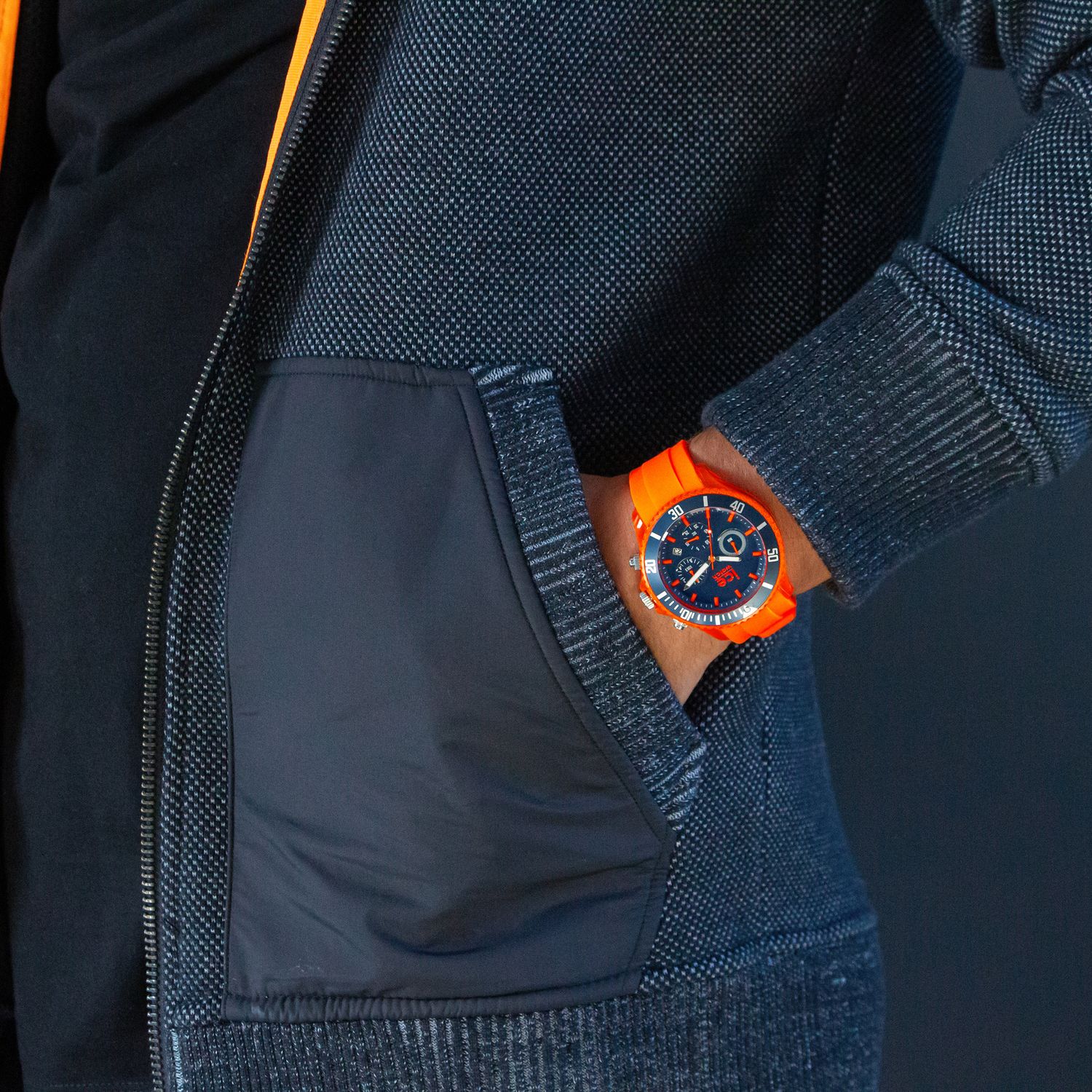 Postaw na sportowy i męski wygląd zegarka ICE chrono – Orange blue! Imponujący i solidny, ten fluorescencyjny pomarańczowy zegarek doda wyjątkowego charakteru Twojemu codziennemu ubraniu. Dzięki głębokiej niebieskiej tarczy, chronometrowi i teksturowanemu silikonowemu paskowi, zegarek ten nada Twojemu nadgarstkowi męskiego i asertywnego charakteru. Co czyni go wyjątkowym? Jest to jedyne chrono z obudową wykonaną z bioplastiku, materiału pochodzącego z biosurowca! Ice-Watch łączy styl i innowacje technologiczne, aby dać życie kolorowej i bardziej przyjaznej dla środowiska kolekcji.