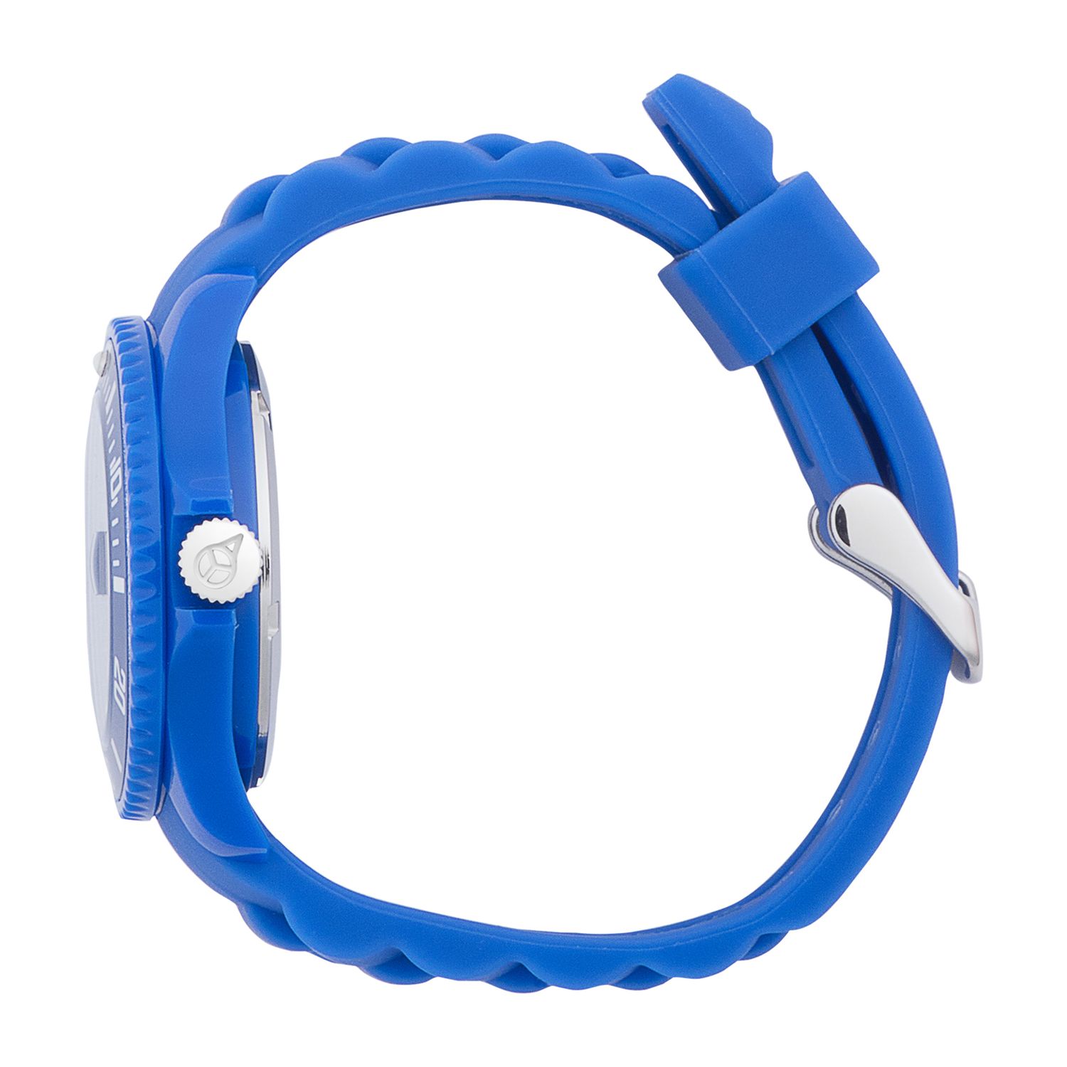 It is a blue silicone watch. Its dial is also blue. Its hands and the hour markers are white and black. This small version is perfect for women and children.