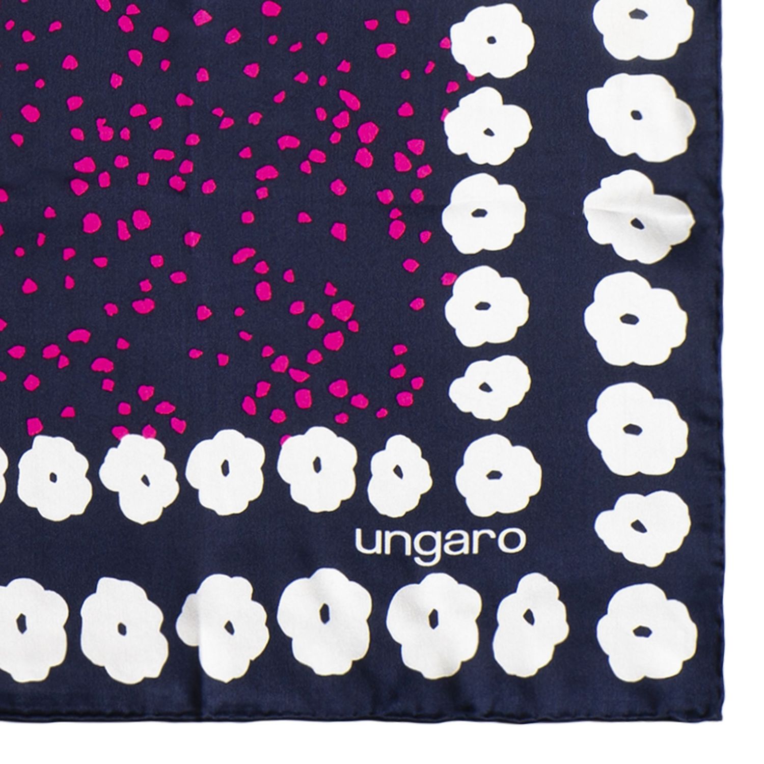 Jedwabny szalik Giada 100% z ciemnoniebieskim,uxia i białym nadrukiem kwiatowym jest świeży i kobiecy.