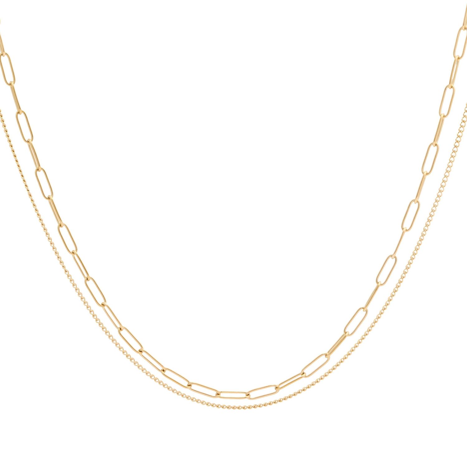 The Olympe necklace uses trompe-l’œil to create the look of two chains in one refined piece. A fine Cuban link meets a larger oval chain for an elegant, minimal balance that complements any style. Available in radiant gold or sleek silver and signed with a discreet Cacharel signature plate, it becomes an effortless statement of style.