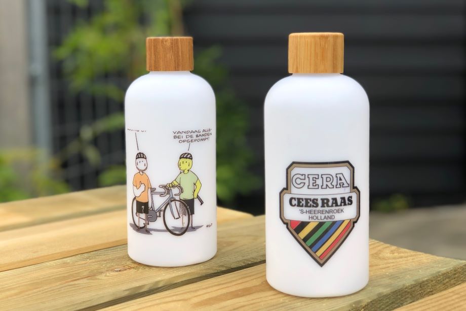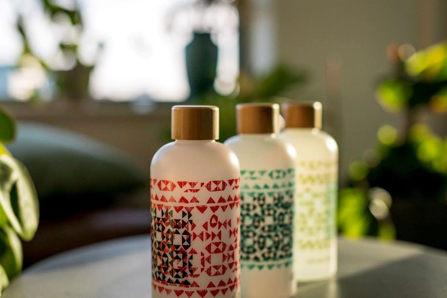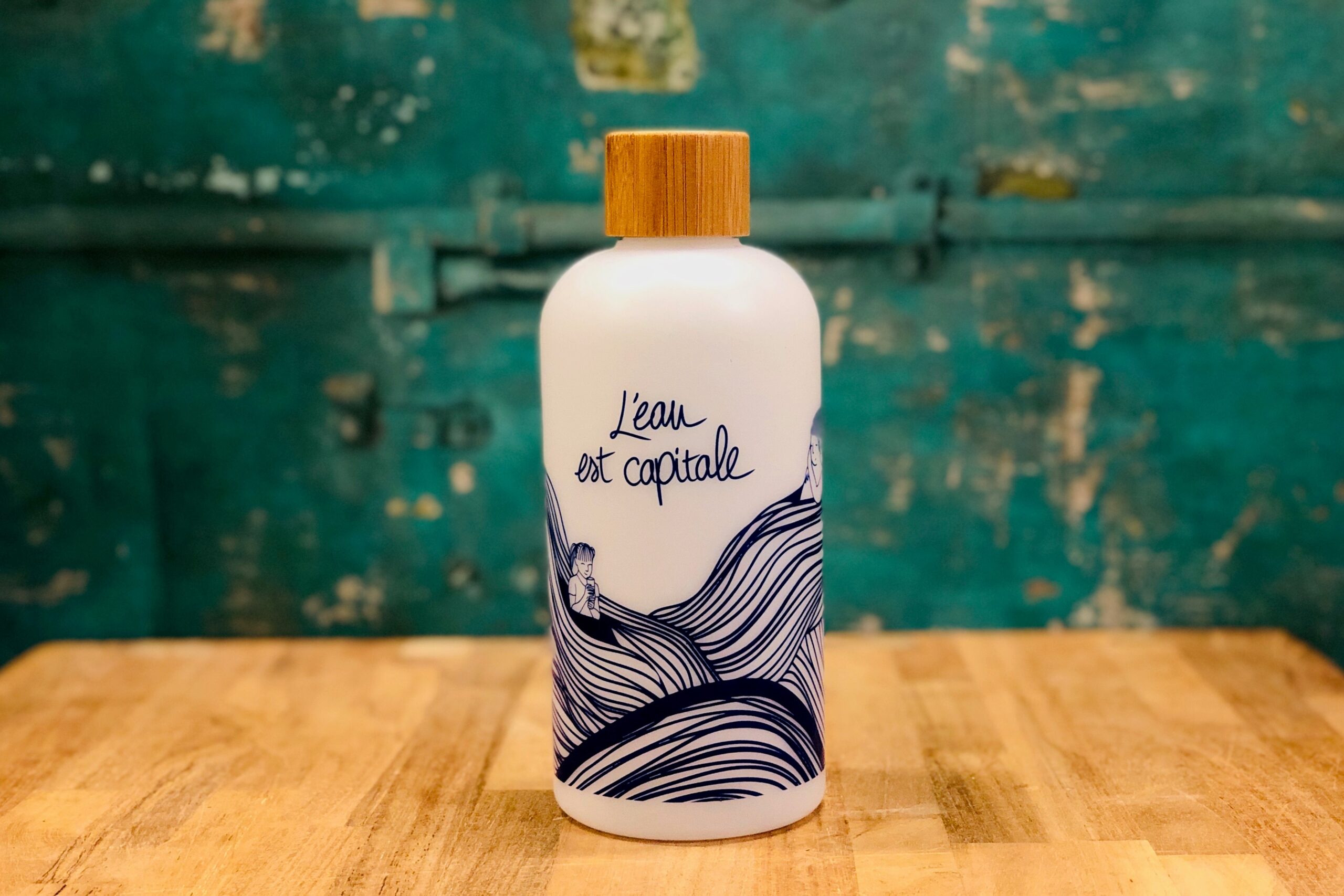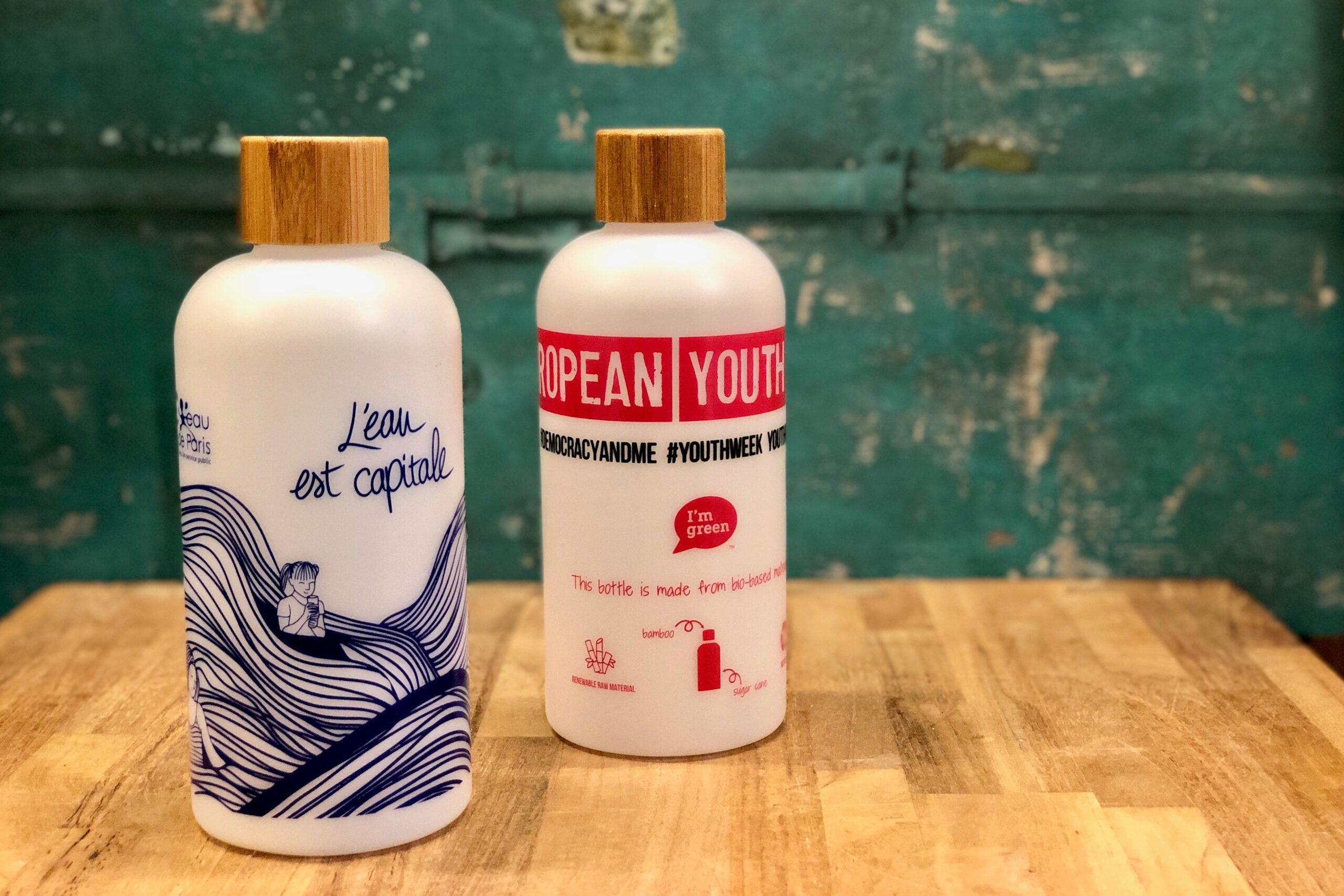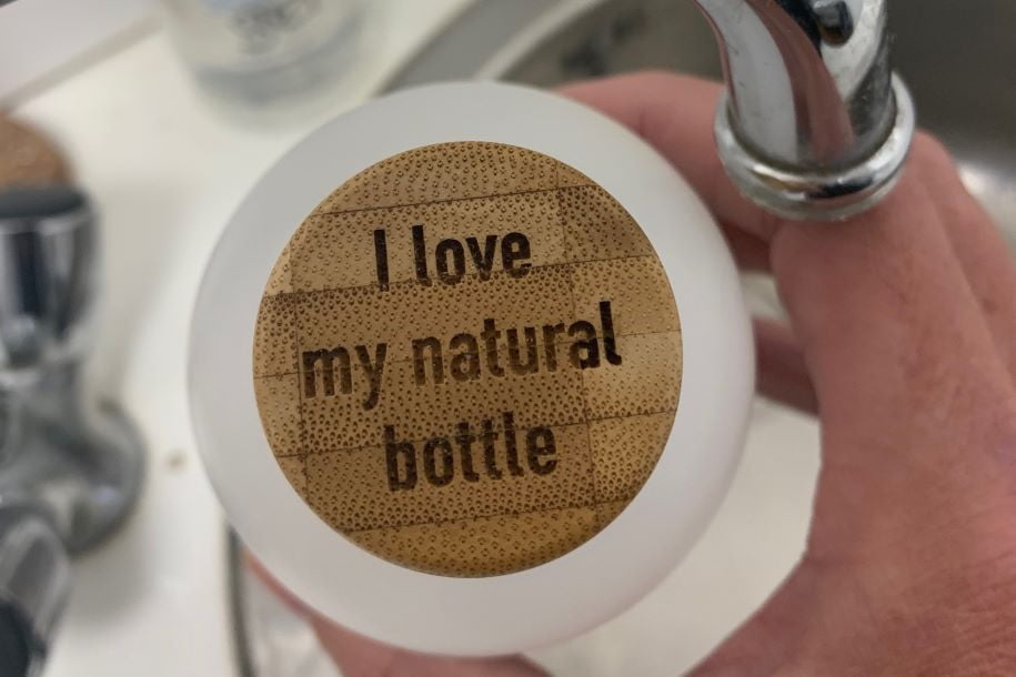 Ta butelka na wodę wielokrotnego użytku jest wykonana z bambusa (wieczko) i trzciny cukrowej (butelka).