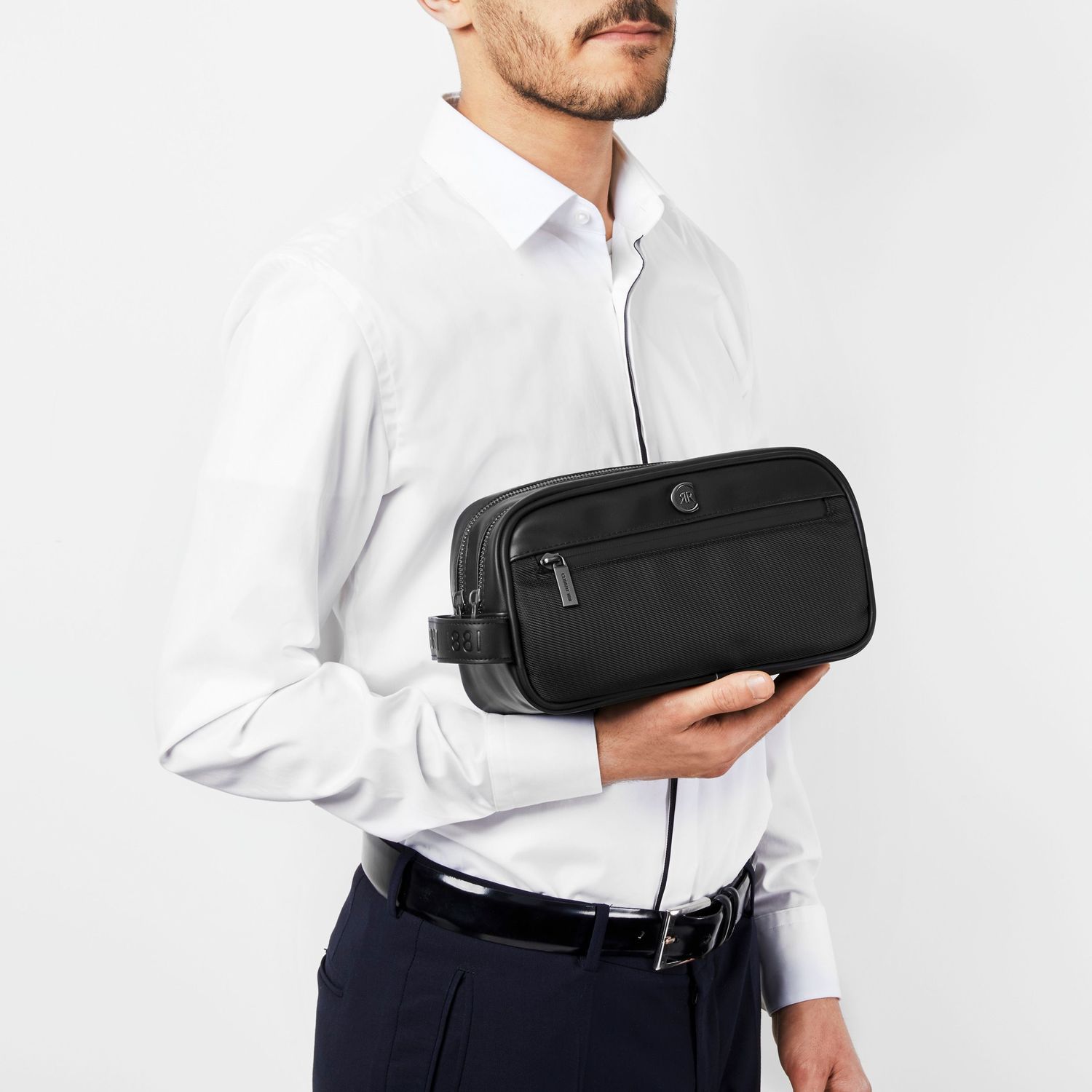 Minimalna, elegancka i niedopowiedziana kolekcja podróżna Bond miesza współczesny nylon z luksusową teksturą skóry wegańskiej dla wyniku, który jest łatwy do noszenia i dopasowania do każdego stroju. Torby są sygnowane matową wersją naszej tabliczki CRR. Wszystkie szczegóły są starannie przemyślane: od zamków błyskawicznych z wygrawerowanym logo po ponadwymiarową, ale subtelną sygnaturę CERRUTI 1881 wytłoczoną na bocznym uchwycie. Lekka, a zarazem kremowa, jest idealną kosmetyczką na podróż.