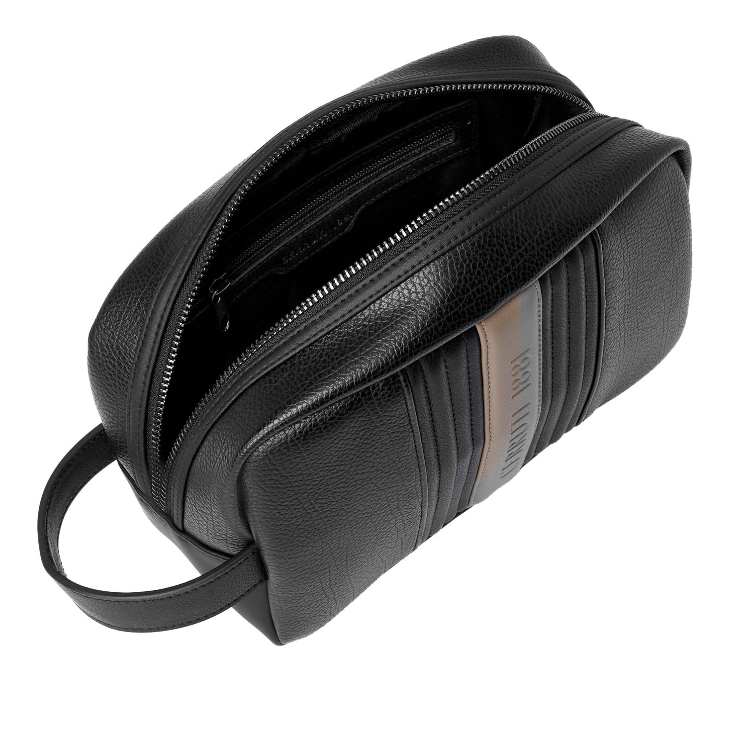 Linia podróżna CERRUTI 1881 „Delano” bawi się kontrastującymi kolorami i teksturami, z pięknie teksturowaną skórą wegańską (PU) obok centralnego beżowego paska z logo luksusowo wytłoczonym logo CERRUTI 1881.
