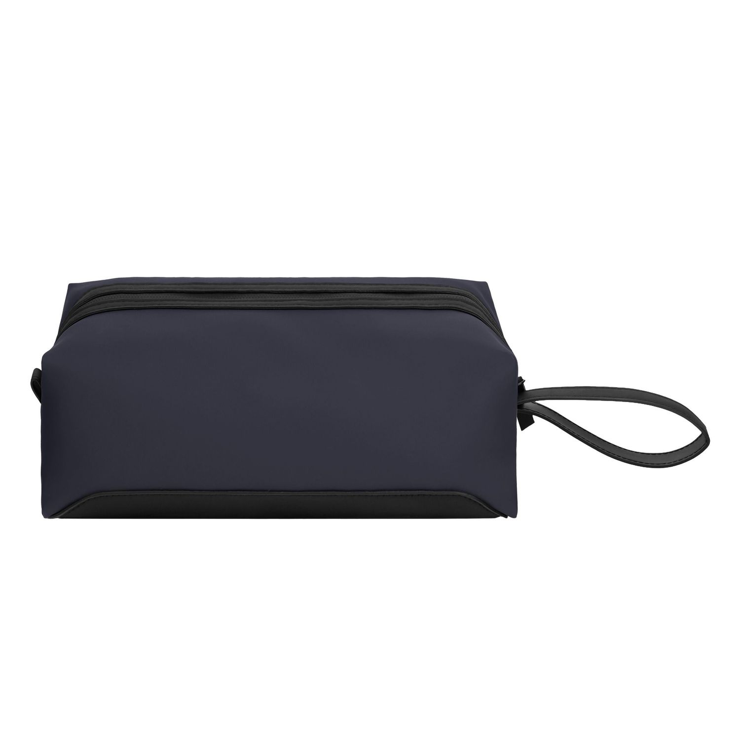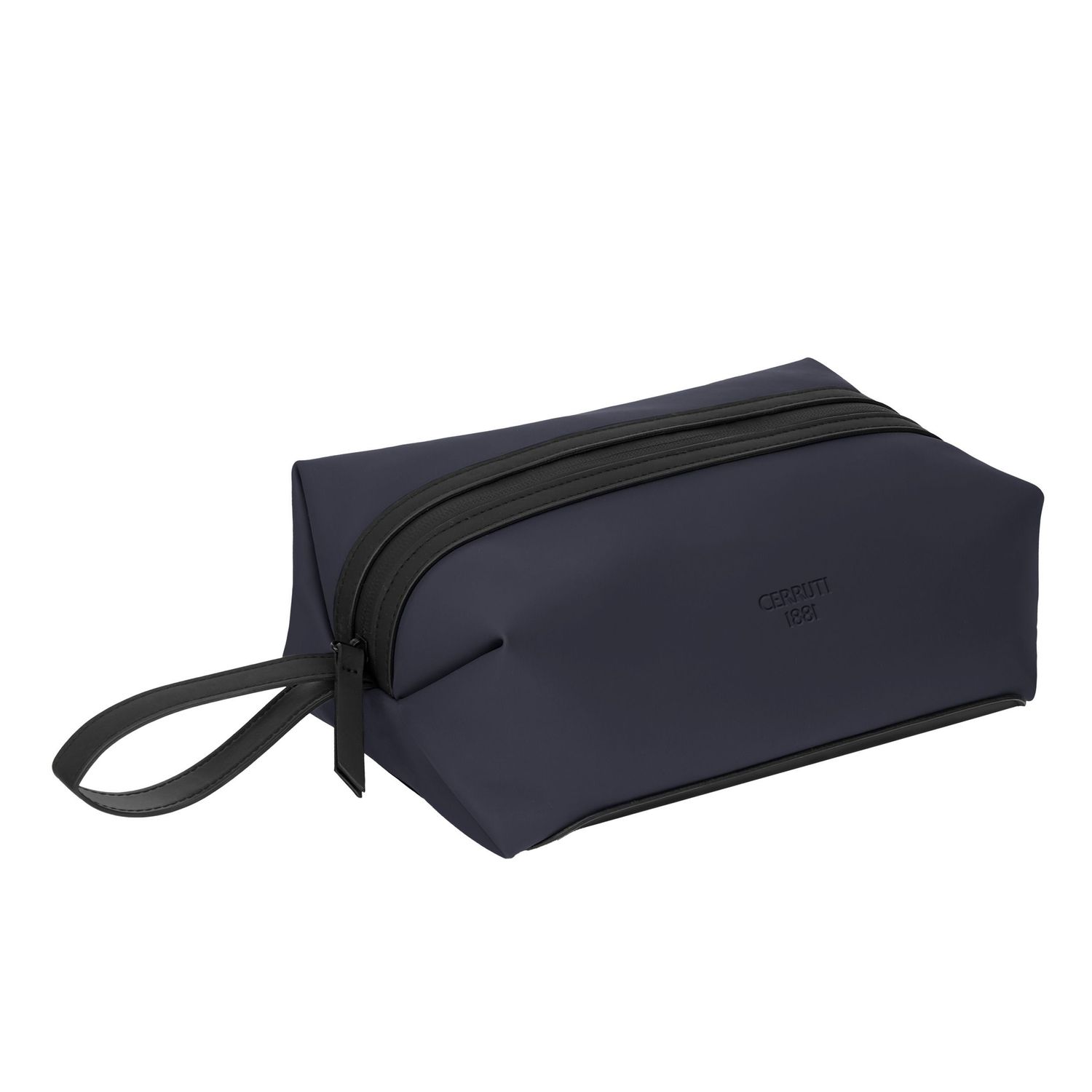 Crafted with a very modern shape that has become one of Cerruti’s signature design codes, the Easton cosmetic bag in navy is elevated by refined black matte trims. Minimally signed with an embossed Cerruti 1881 logo, it embodies a clean and contemporary attitude. The interior is discreetly monogramed, offering a subtle nod to the house’s identity. A practical wristlet adds ease of use, making it an ideal piece for movement. The ultimate minimalistic and practical travel companion to organise all essentials.