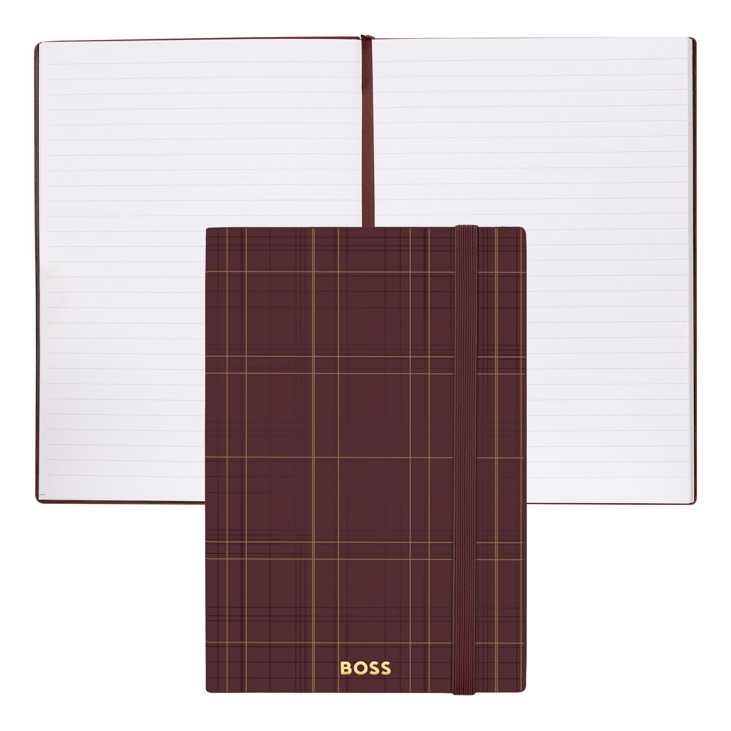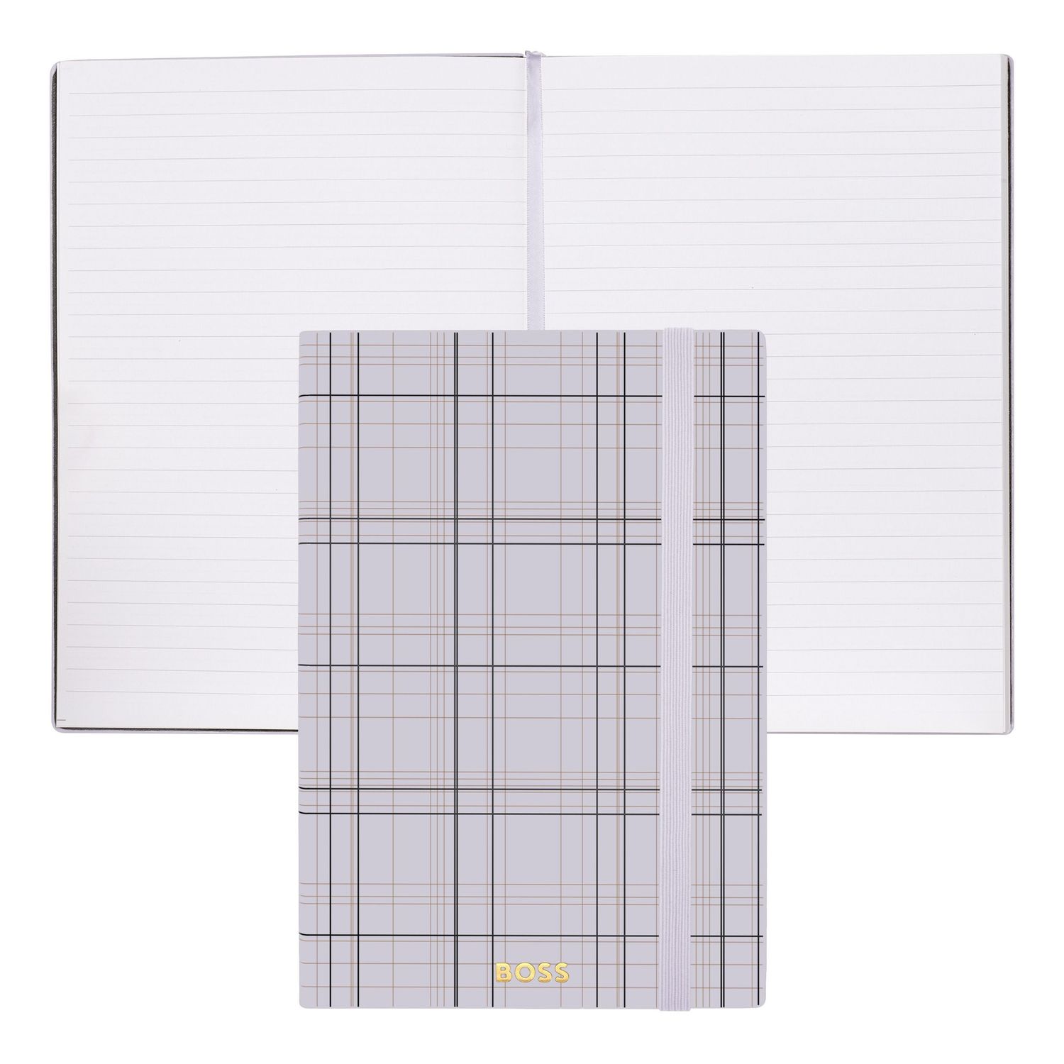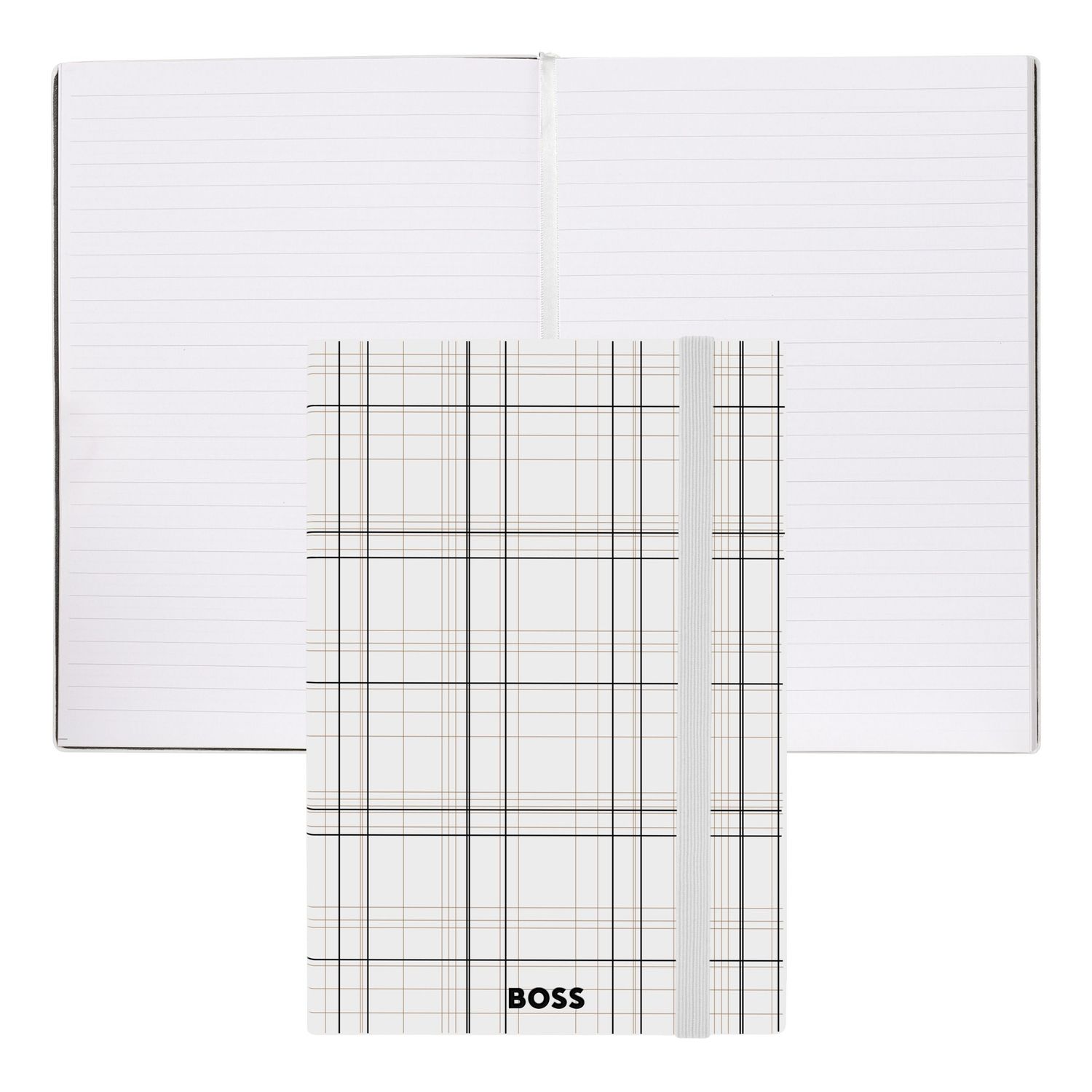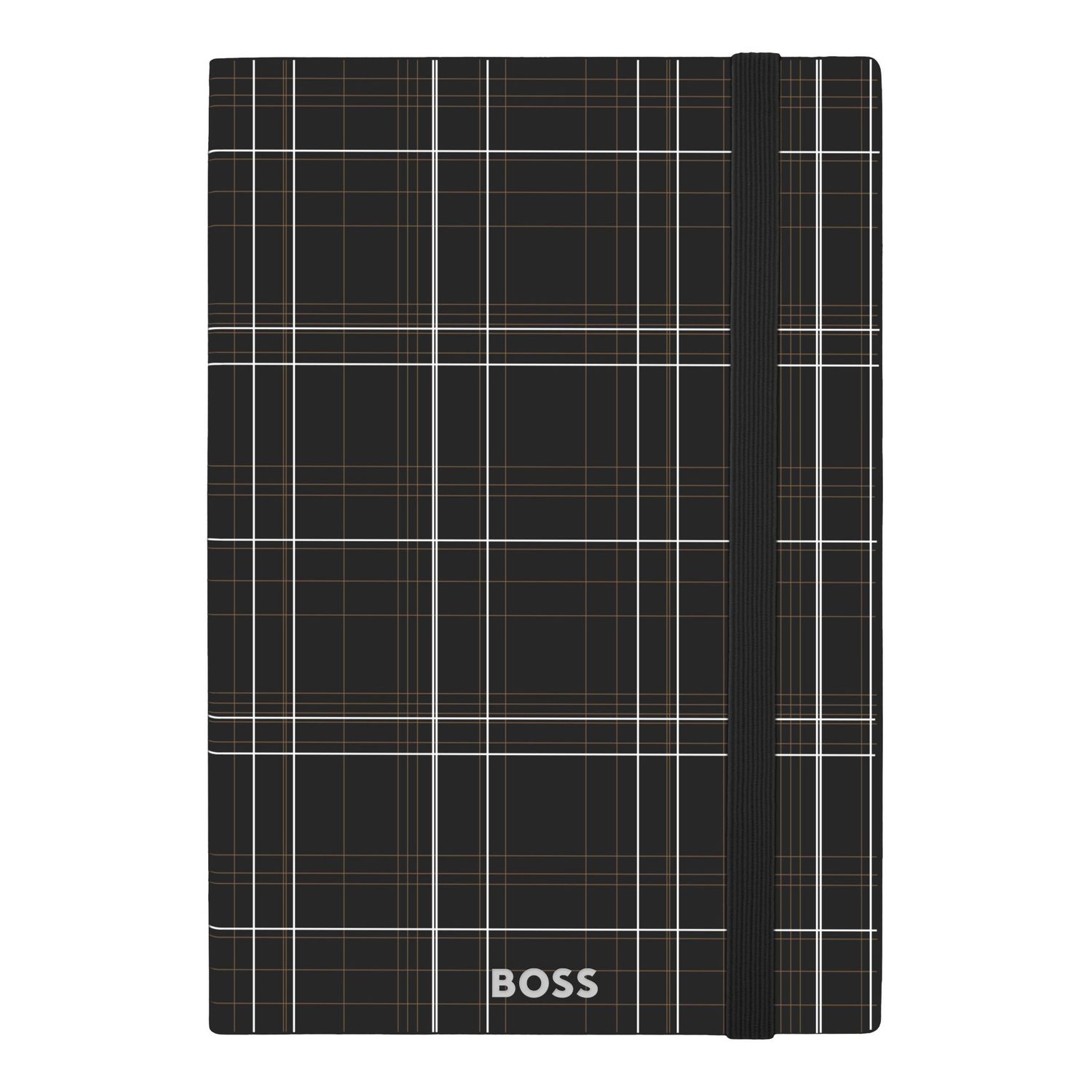 This Checkered notebook is crafted in smooth PU and features a bold checkered print inspired by the BOSS ready-to-wear line, creating a strong and graphic identity. The design is finished with a BOSS logo embossed on the front and highlighted with silver foil, while a vertical elastic closure and matching page marker ensure a cohesive look. Presented in an A5 format with lined paper, it contains 192 pages and combines everyday functionality with a distinctive visual signature.