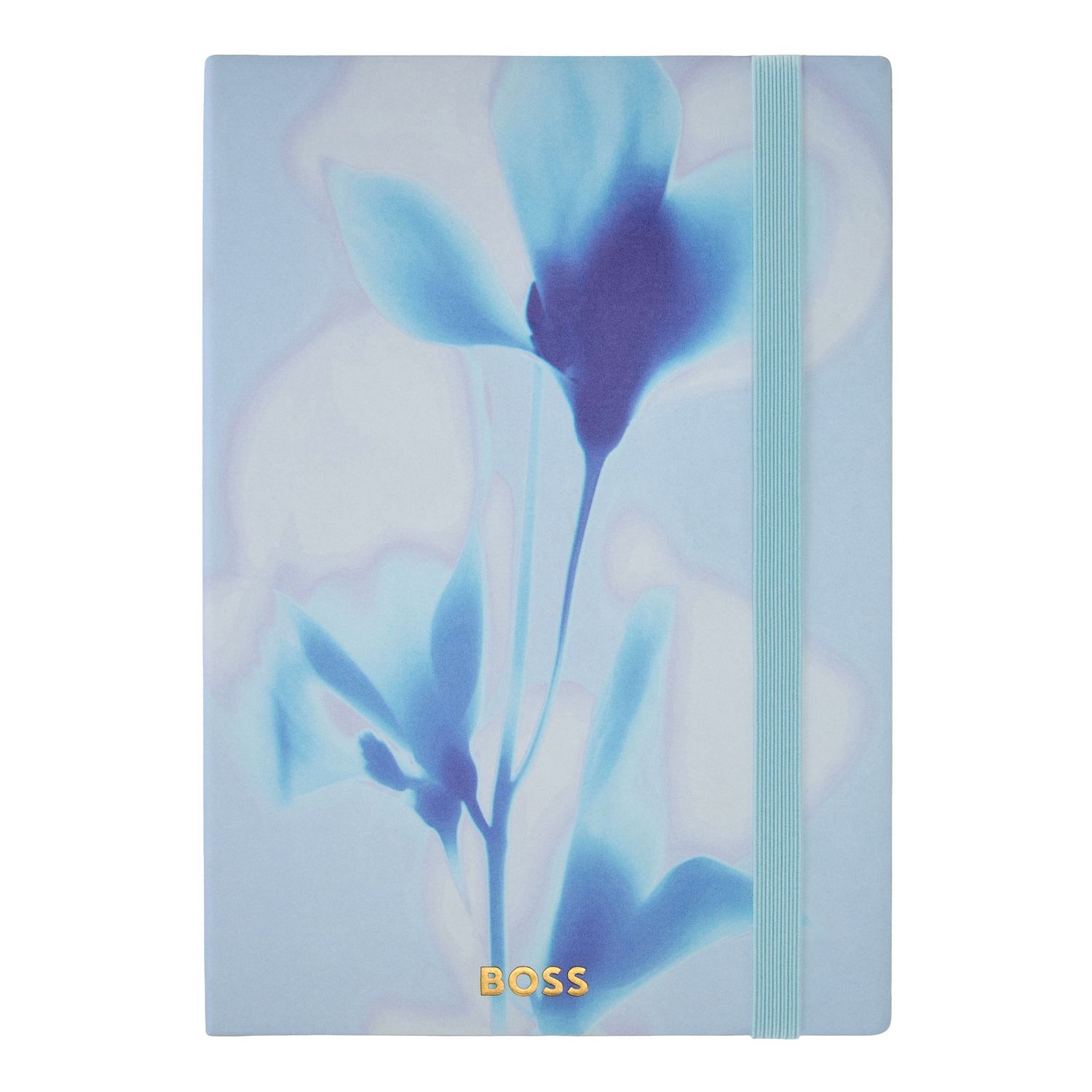The Holographic notebook features a soft, blurred floral print inspired by the BOSS Lady ready-to-wear line, giving the design a light and airy visual character. Offered in a soothing palette of navy, light blue, nude, and pastel green, each version brings a sense of subtle delicacy and modern elegance. The cover is finished with a BOSS logo embossed and highlighted with gold foil, while a vertical elastic closure and matching page marker echo the tones of the print for a cohesive finish. Each notebook is presented in an A5 format with lined paper and contains 192 pages, combining visual softness with everyday functionality.