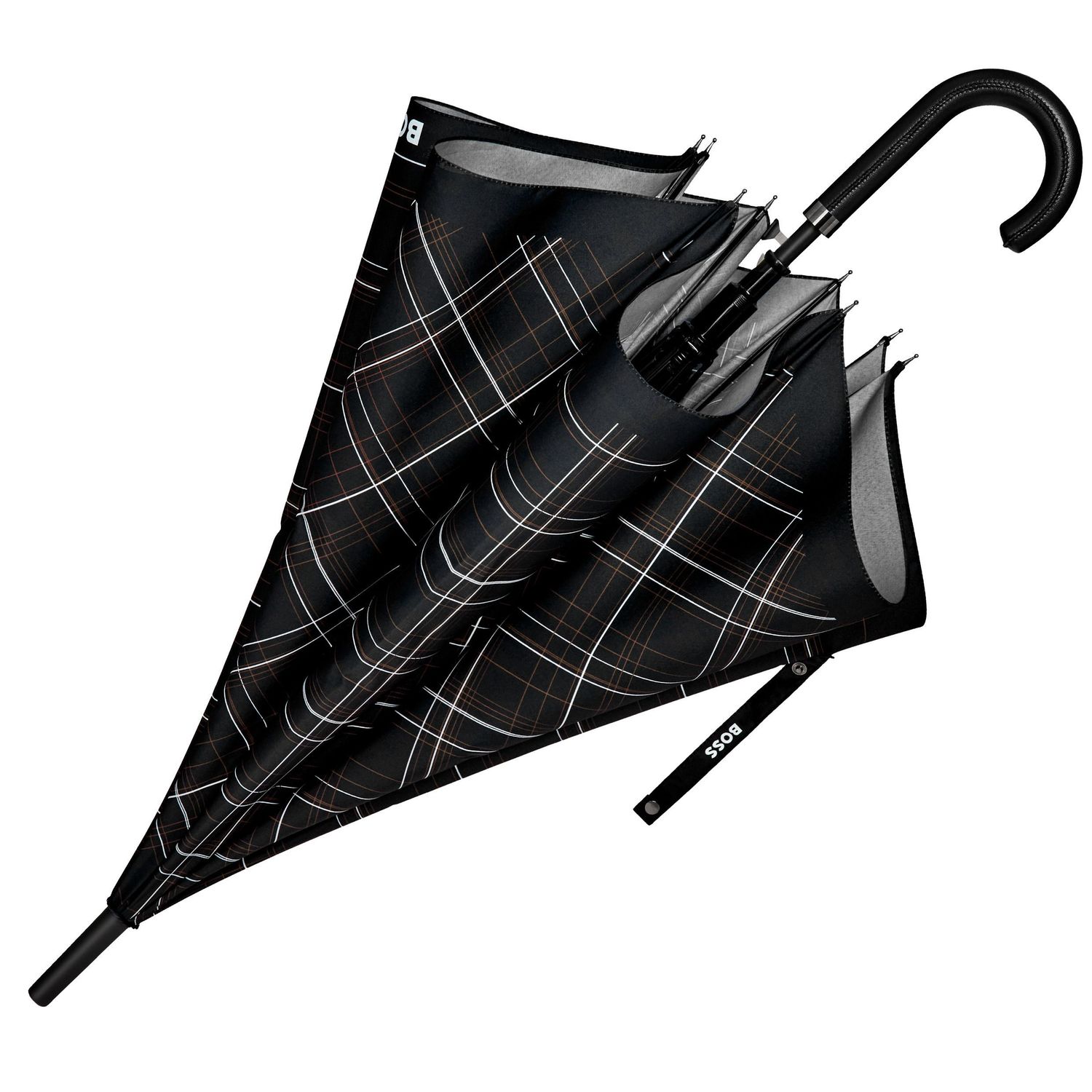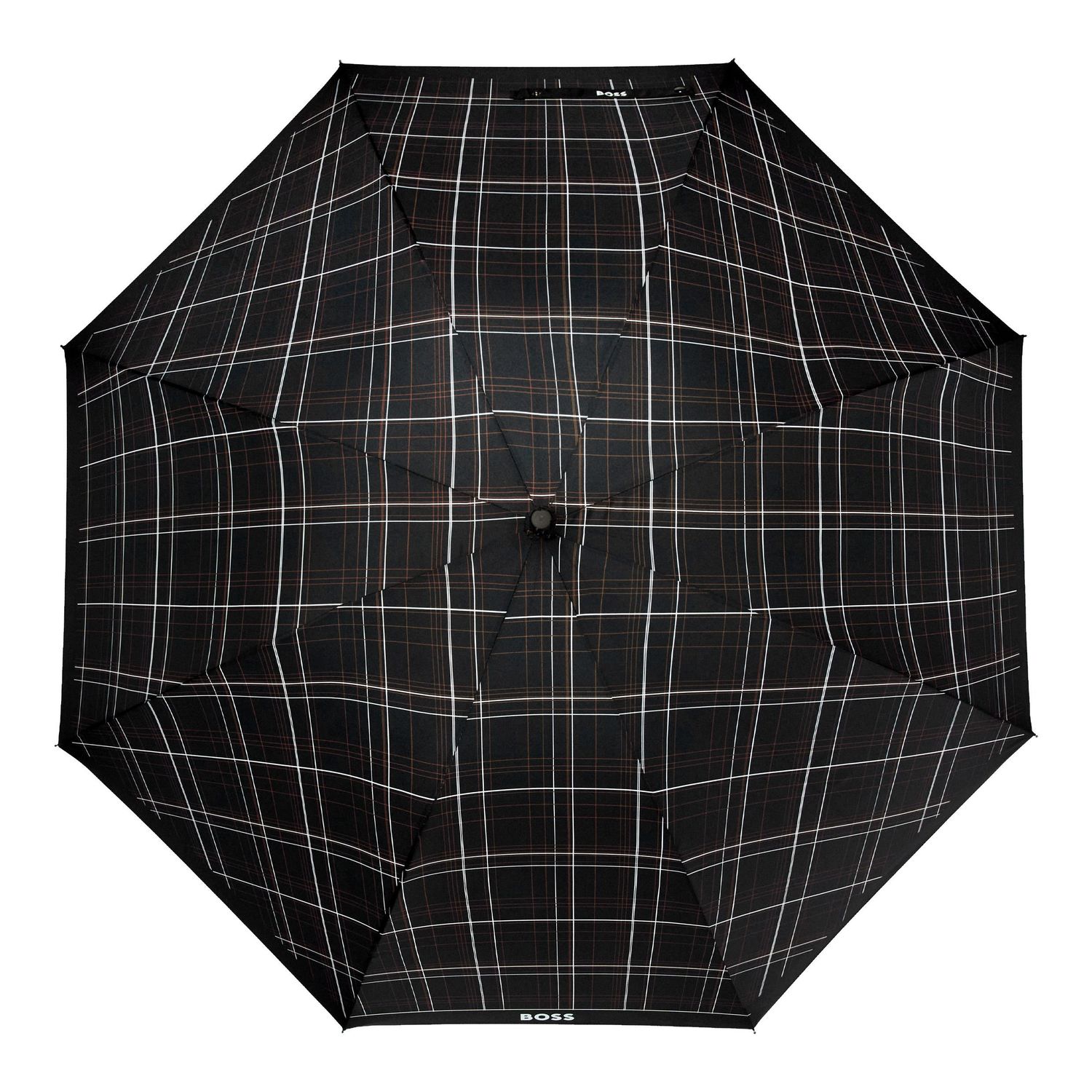 The Checkered umbrella features a striking print borrowed from the BOSS runway, turning an everyday essential into a true fashion statement through its graphic take on the brand’s iconic colors.This city size is elegant and ideal for everyday use. Presented exclusively in black, it comes with a refined handle wrapped in a leatherlike material and is signed with an embossed BOSS logo for an elevated finish.