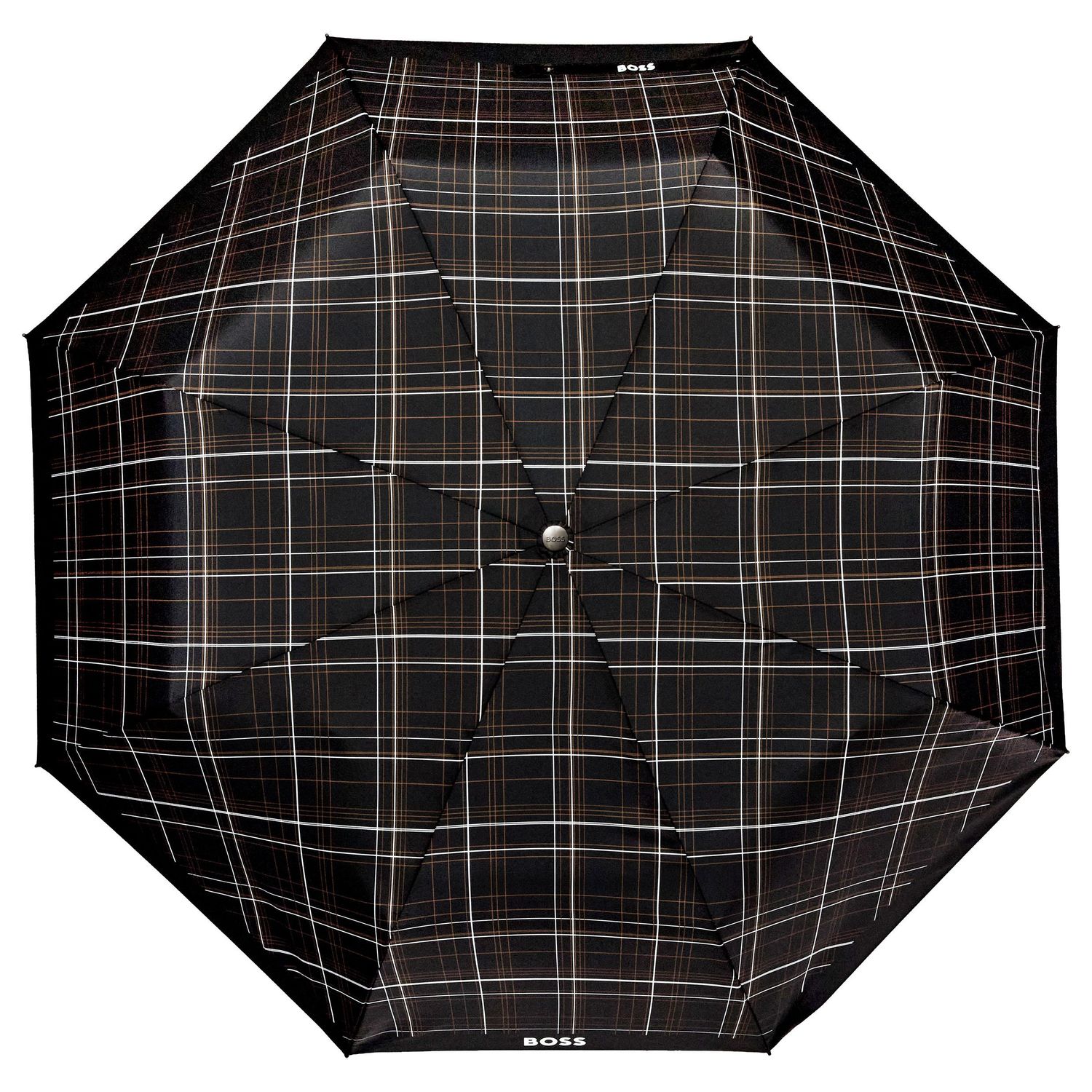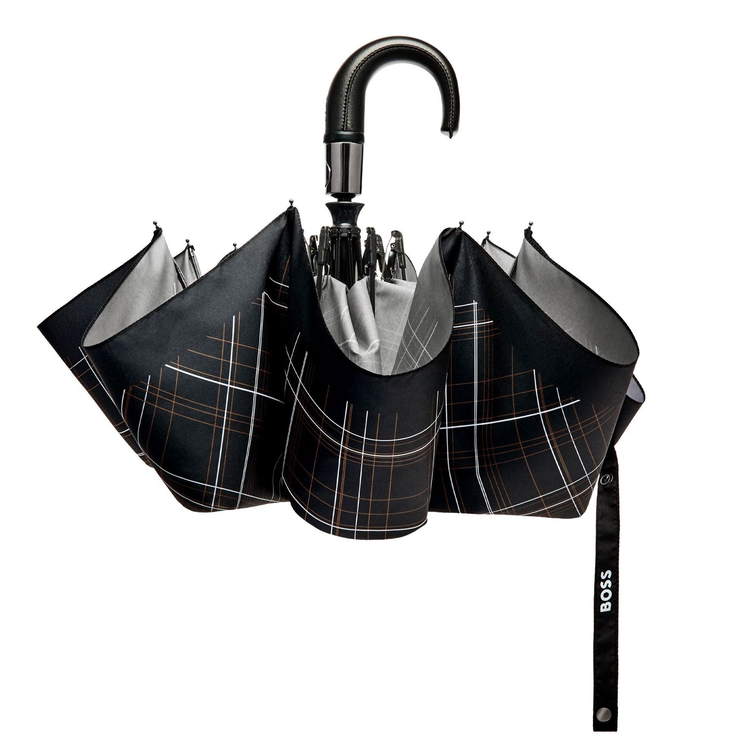 The Checkered umbrella features a striking print borrowed from the BOSS runway, turning an everyday essential into a true fashion statement through its graphic take on the brand’s iconic colors. This pocket size is practical and compact. Presented exclusively in black, it comes with a refined handle wrapped in a leatherlike material and is signed with an embossed BOSS logo for an elevated finish.