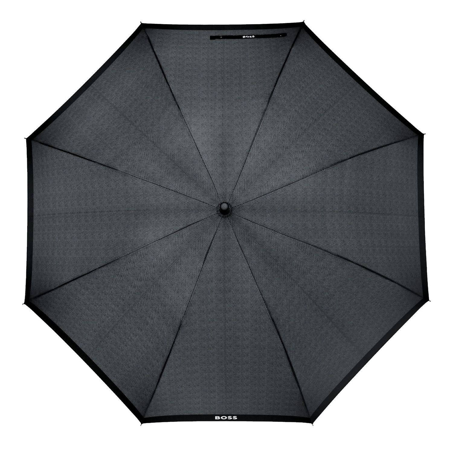 The Chevron umbrella introduces a fresh interpretation of the herringbone motif rooted in BOSS history, subtly echoing the brand’s suiting tradition while keeping the design minimal and masculine with a modern twist. This elegant city size is perfect for everyday use, it features a handle luxuriously wrapped in a leatherlike material with BOSS embossing, while all trims in deep gun add to its understated, elevated feel.