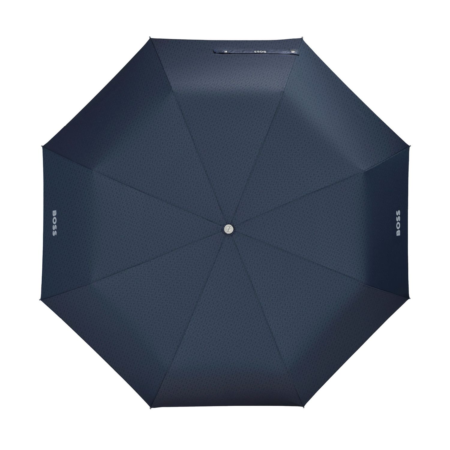 Kieszonkowy parasol Double B w kolorze granatowym z chromowanymi metalowymi akcentami łączy w sobie praktyczność i elegancję z logo BOSS Double B w trójwymiarowym wykonaniu, wzmocnionym metalicznym poszyciem na końcówkach rączki. Posiada miękką, gumową rączkę i czaszę z monogramem ton w ton. Parasol został zaprojektowany z lekką, kompaktową ramą i podwójnym automatycznym systemem otwierania i zamykania, zapewniając płynne wrażenia. Wodoodporna czasza i luksusowy pokrowiec zapinany na zamek błyskawiczny z grawerowanymi wykończeniami BOSS zwiększają wygodę i przenośność tego eleganckiego akcesorium.
