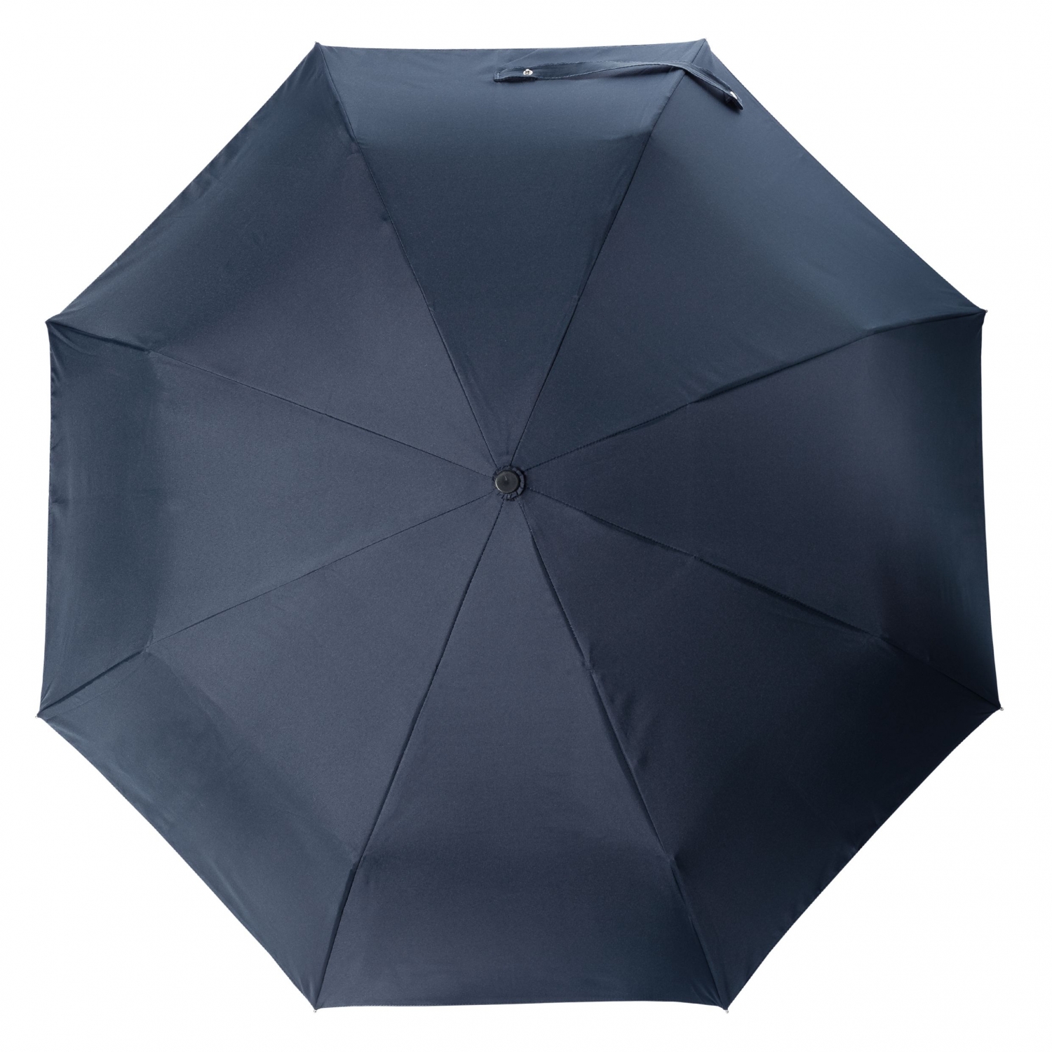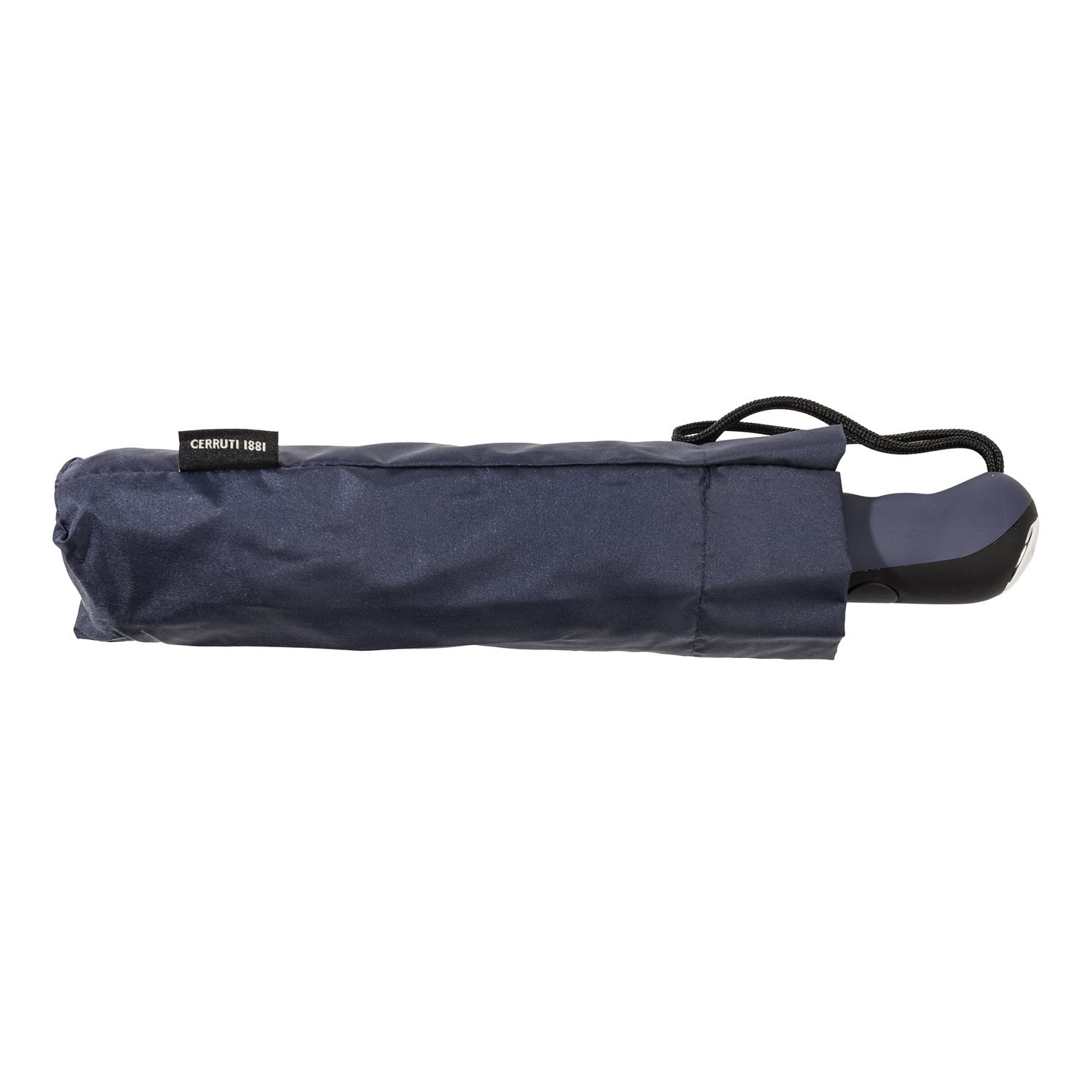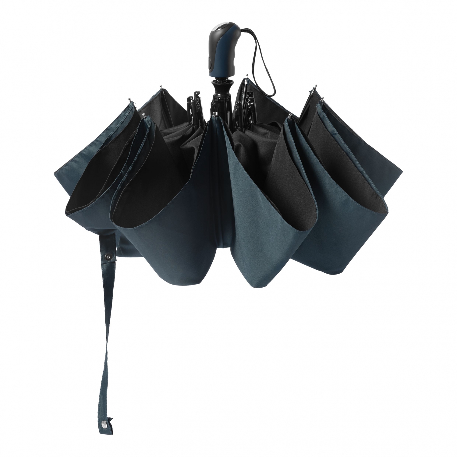 Kieszonkowy parasol „Irving” gra na kontraście pomiędzy czarnym a granatowym. Podwójny daszek jest niebieski na zewnątrz i czarny wewnątrz, a jego pocierany, wykończony gumą uchwyt jest bardzo wygodny w dłoni.