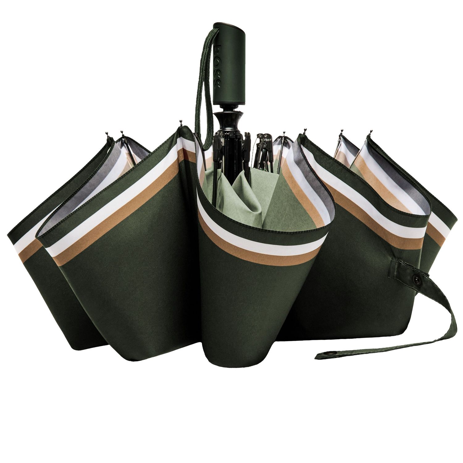 The Varsity umbrella channels a colorful, youthful energy with its bold, varsity-inspired graphical take on the Double B. The canopy is finished with the signature three-color stripe along the edge, adding a crisp nod to the brand’s codes. Offered in a compact pocket format, it comes in black, blue, forest green, and burgundy, each featuring a tonal handle luxuriously finished with the BOSS logo embossed.