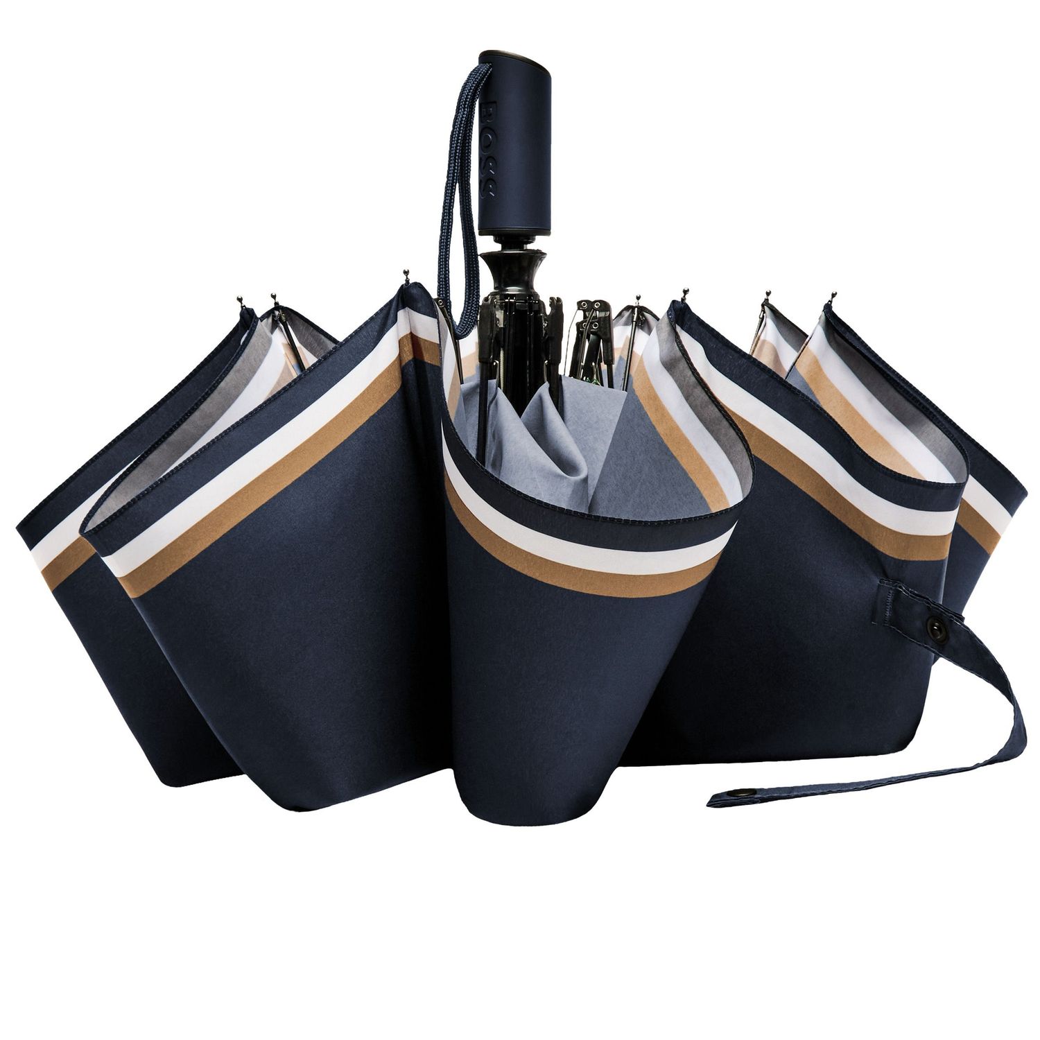 The Varsity umbrella channels a colorful, youthful energy with its bold, varsity-inspired graphical take on the Double B. The canopy is finished with the signature three-color stripe along the edge, adding a crisp nod to the brand’s codes. Offered in a compact pocket format, it comes in black, blue, forest green, and burgundy, each featuring a tonal handle luxuriously finished with the BOSS logo embossed.