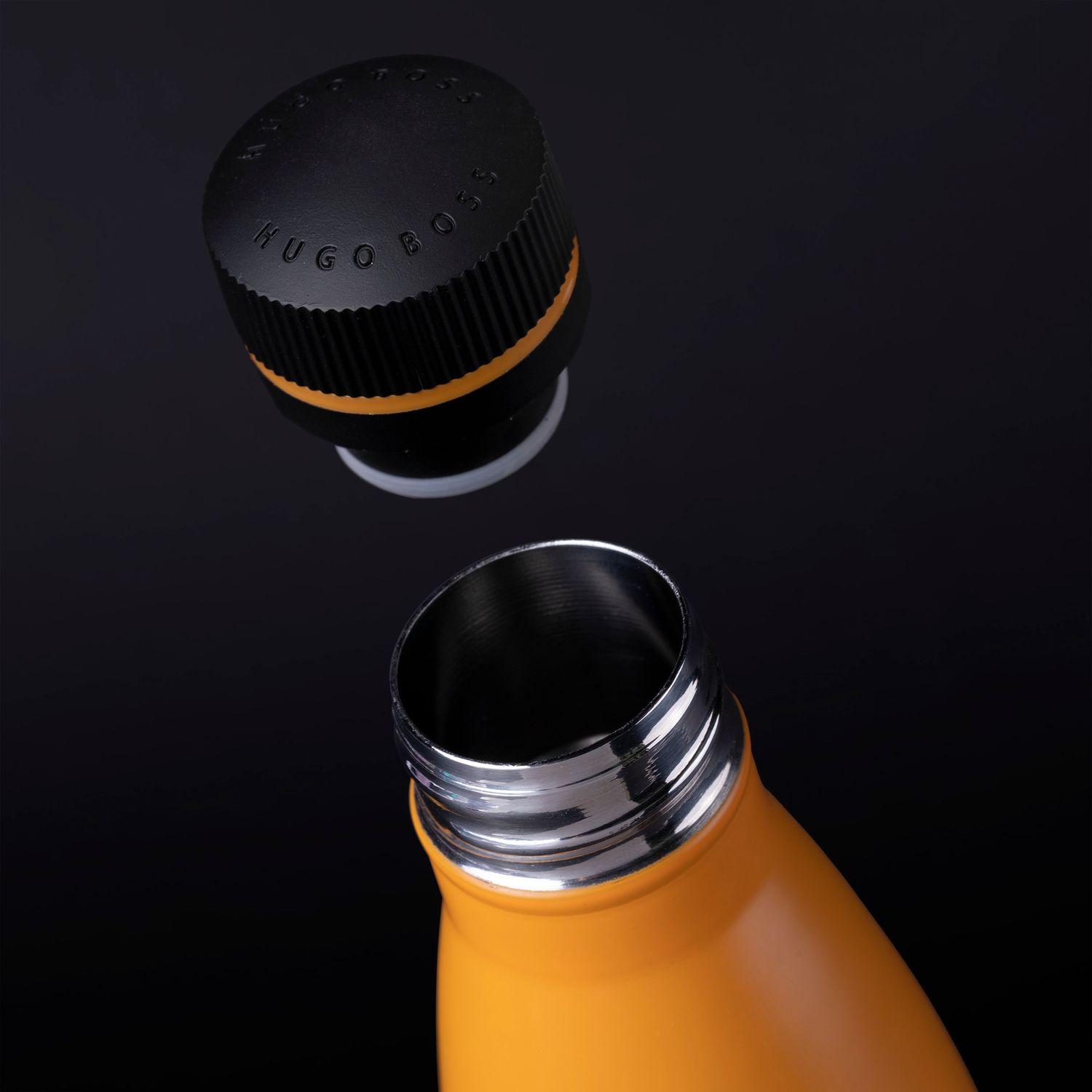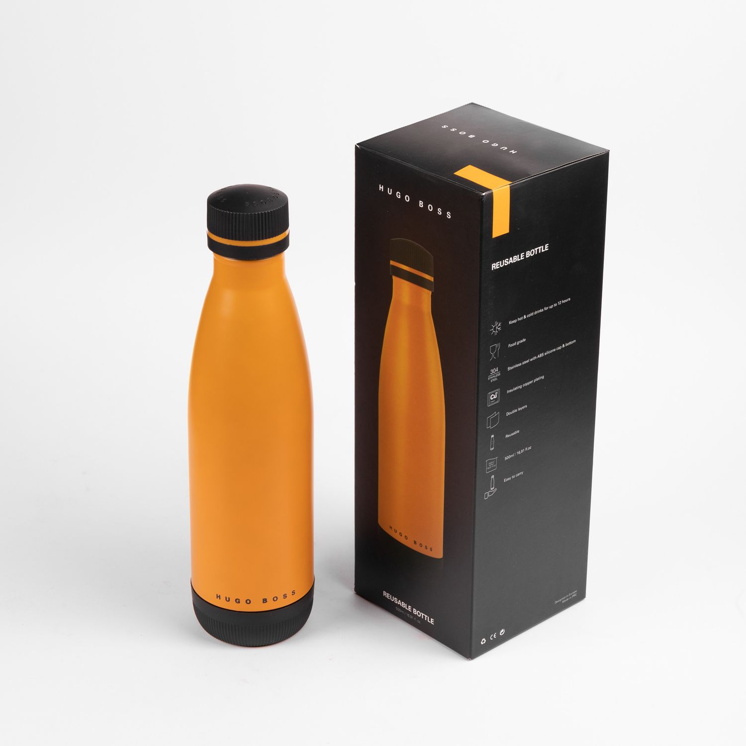 Butelka wielokrotnego użytku Gear Matrix łączy w sobie zrównoważony rozwój i styl. Stworzona do przenoszenia zarówno gorących, jak i zimnych napojów, jej żywy design i dopracowane detale odzwierciedlają resztę aktywnej linii, tworząc odważny świat funkcjonalnych akcesoriów. Dostępna w kolorach: niebieskim, czerwonym, khaki, żółtym, czarnym i srebrnym. Silikonowa podstawa butelki wykonana jest z ABS i posiada lekką amortyzację, która pomaga chronić powierzchnie, na których stoi butelka, a także zmniejsza hałas podczas jej odstawiania. Można ją łatwo przenosić. Wyposażona w logo HUGO BOSS, hermetyczna zakrętka z silikonu ABS utrzymuje ciepło lub zimno napoju przez około 16 godzin.