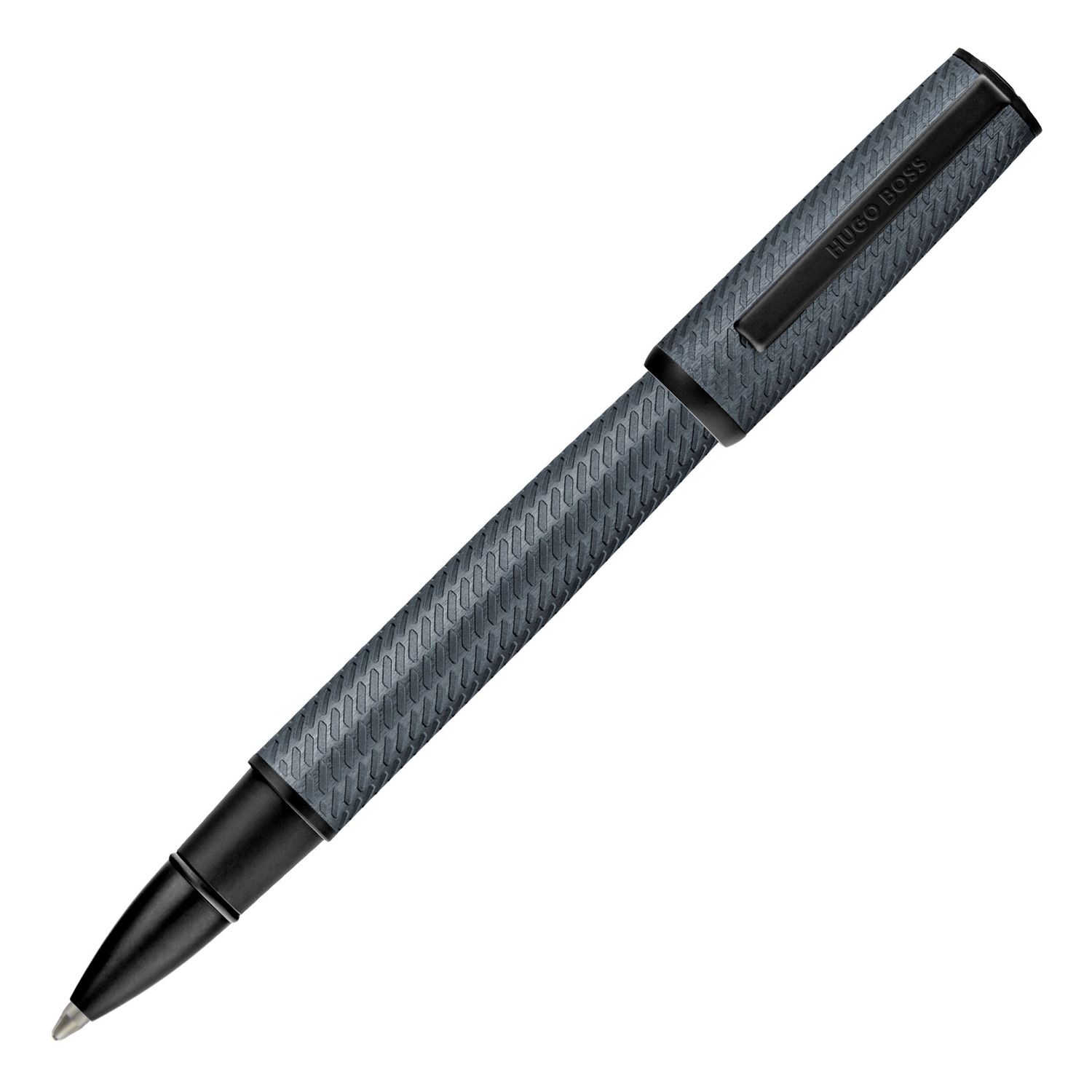 The Arche Pattern pen introduces a modern tapered silhouette, elevated by an innovative brushed-aluminum surface engraved with a pattern inspired by activewear mesh. Designed for a distinctly modern and innovative feel, it is finished in dark grey with black trims, a Double B signature at the top, and a clip adorned with the HUGO BOSS logo. Clean lines and contrastive finishes create a modern, exclusive aesthetic with a forward-looking edge.