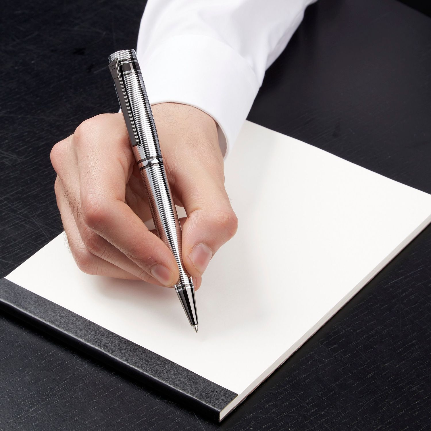 Nieco bardziej nieoczekiwana i wyrafinowana wersja naszej nowej kolekcji artykułów piśmiennych „Bold”, ten artykuł piśmienny jest w całości wygrawerowany w poziome paski. Ta część asortymentu jest deklaracją stylu i elegancji sama w sobie i jest oferowana w 3 luksusowych kolorach powłoki metalowej: czarnym, pistoletowym i chromowanym Luksusowym. Gra z kontrastującymi kolorami, wykończeniami i wyrafinowanymi detalami jest kluczem do naszego procesu projektowania. Każdy element subtelnie uzupełnia inny, dając efekt, który jest zarówno elegancki, jak i niewymuszony.