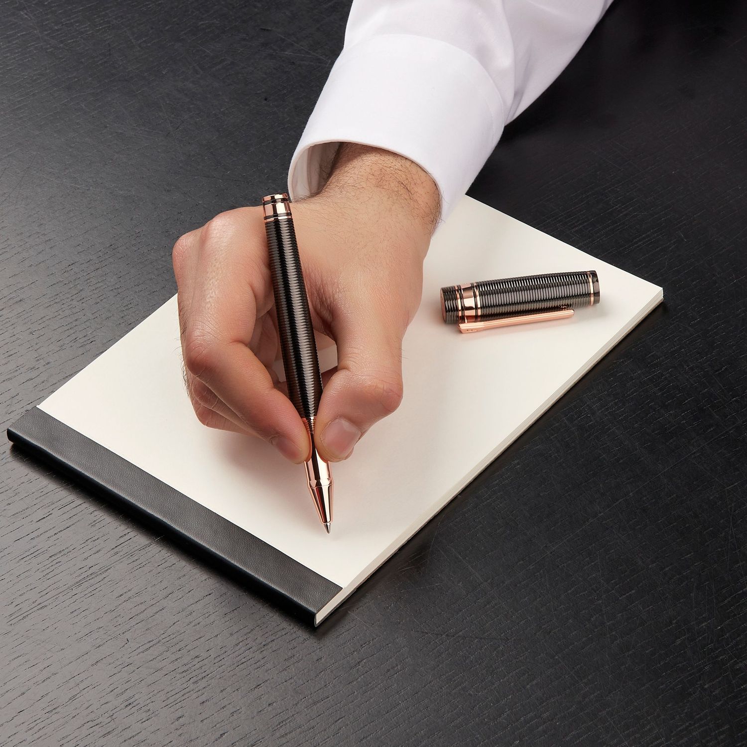Nieco bardziej nieoczekiwana i wyrafinowana wersja naszej nowej kolekcji artykułów piśmiennych „Bold”, ten artykuł piśmienny jest w całości wygrawerowany w poziome paski. Ta część asortymentu jest deklaracją stylu i elegancji sama w sobie i jest oferowana w 3 luksusowych kolorach powłoki metalowej: czarnym, pistoletowym i chromowanym Luksusowym. Gra z kontrastującymi kolorami, wykończeniami i wyrafinowanymi detalami jest kluczem do naszego procesu projektowania. Każdy element subtelnie uzupełnia inny, dając efekt, który jest zarówno elegancki, jak i niewymuszony.
