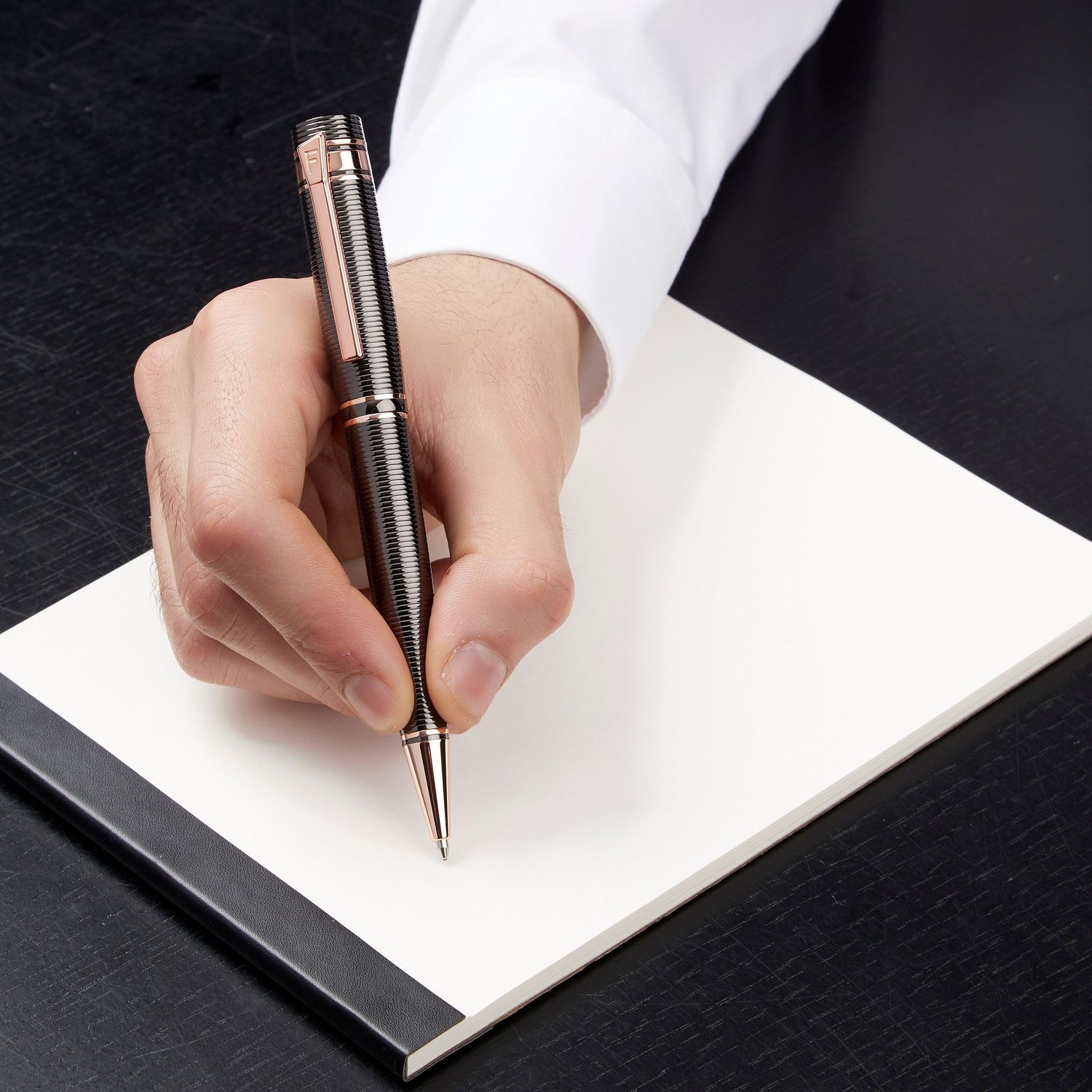 Nieco bardziej nieoczekiwana i wyrafinowana wersja naszej nowej kolekcji artykułów piśmiennych „Bold”, ten artykuł piśmienny jest w całości wygrawerowany w poziome paski. Ta część asortymentu jest deklaracją stylu i elegancji sama w sobie i jest oferowana w 3 luksusowych kolorach powłoki metalowej: czarnym, pistoletowym i chromowanym Luksusowym. Gra z kontrastującymi kolorami, wykończeniami i wyrafinowanymi detalami jest kluczem do naszego procesu projektowania. Każdy element subtelnie uzupełnia inny, dając efekt, który jest zarówno elegancki, jak i niewymuszony.