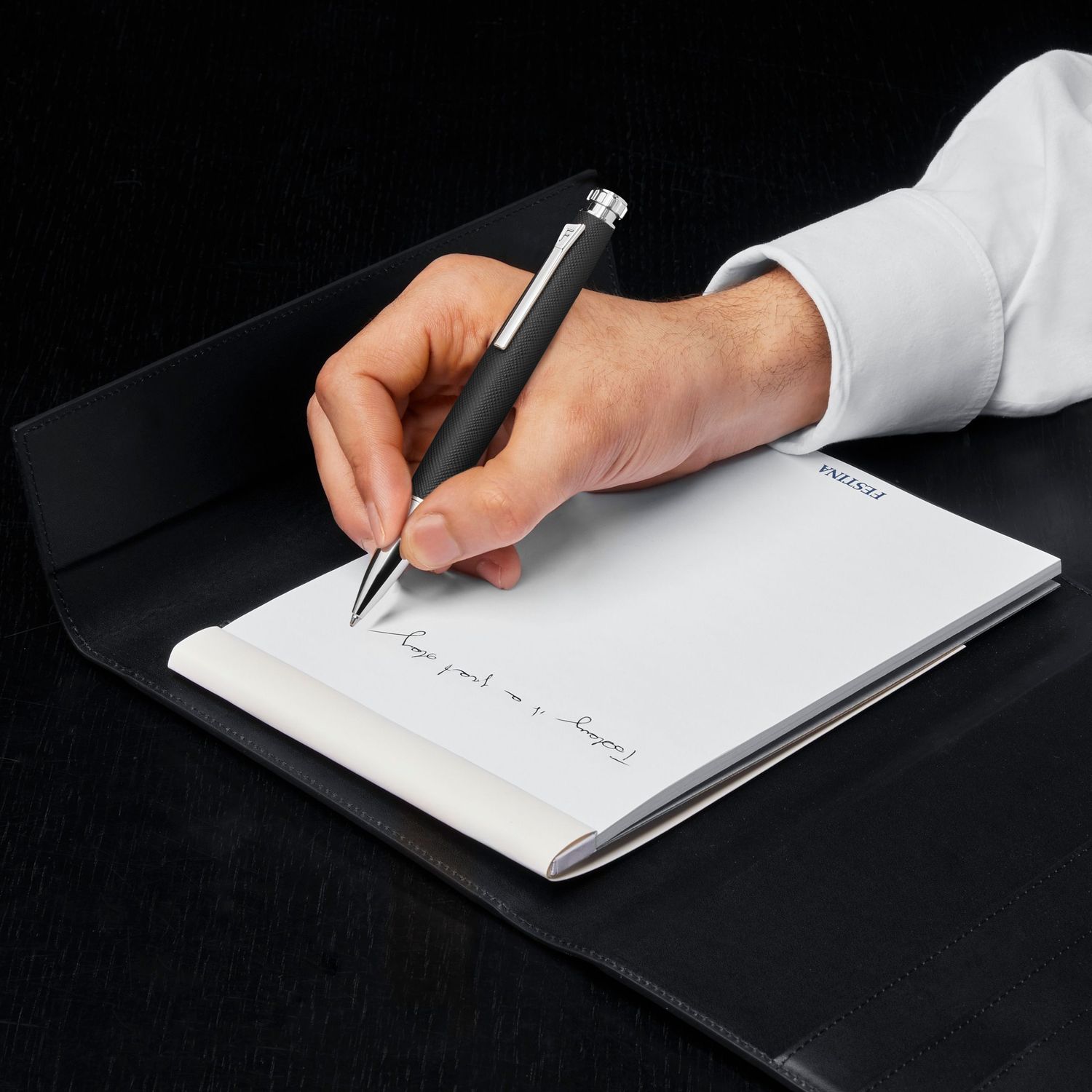 Nasz najlepiej sprzedający się długopis Chronobike, o zdecydowanie aktywnej strukturze i wysokiej jakości detalach, jest ponownie wydany w nowym wykończeniu: owinięty w teksturowany wegański materiał saffiano, pasujący do tytułowej małej skórzanej linii produktów. Ta zdecydowanie luksusowa opcja jest oferowana w 3 kolorach: czarnym, camel i navy.