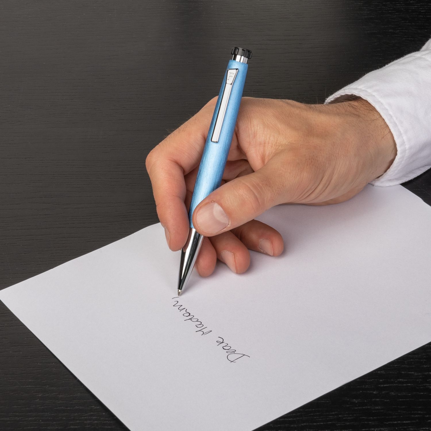 Pióro kulkowe Chronobike o jasnoniebieskiej, szczotkowanej fakturze z delikatnymi, chropowatymi, metalowymi akcentami łączy w sobie sportowy i luksusowy charakter.