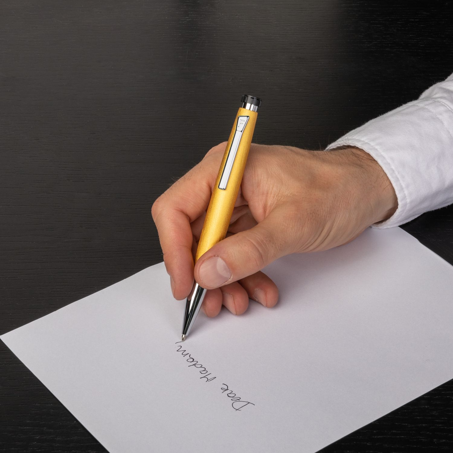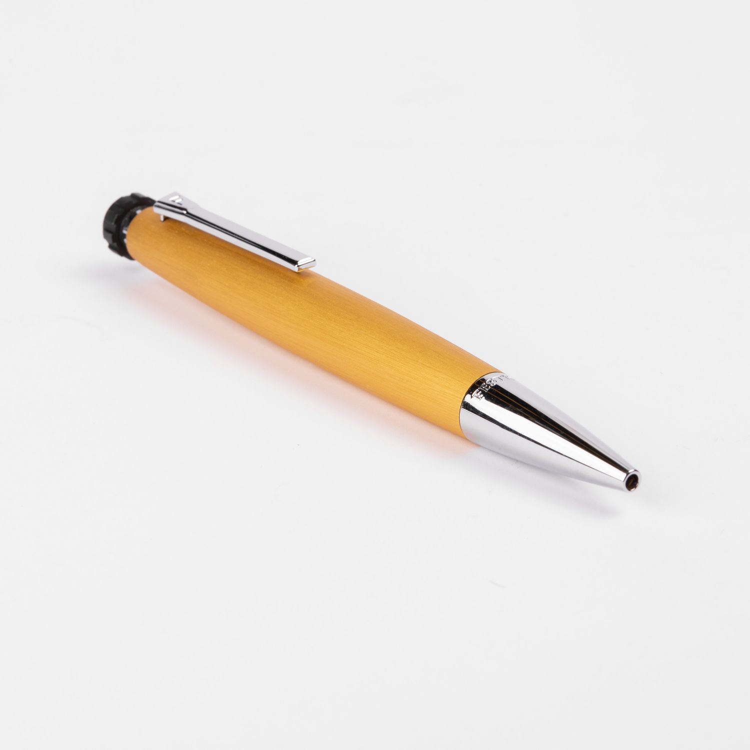 Pióro kulkowe Chronobike o żółtej, szczotkowanej fakturze z delikatnymi, chropowatymi, metalowymi akcentami łączy w sobie sportowy i luksusowy charakter.