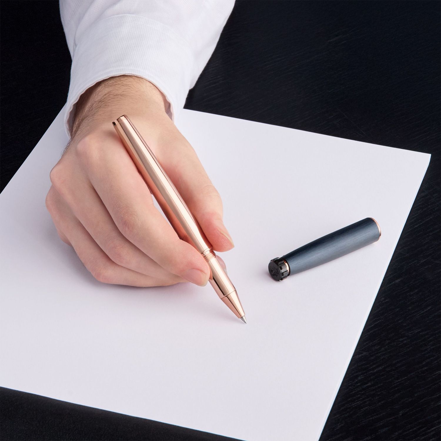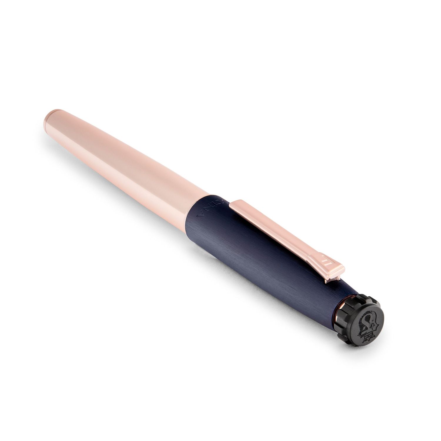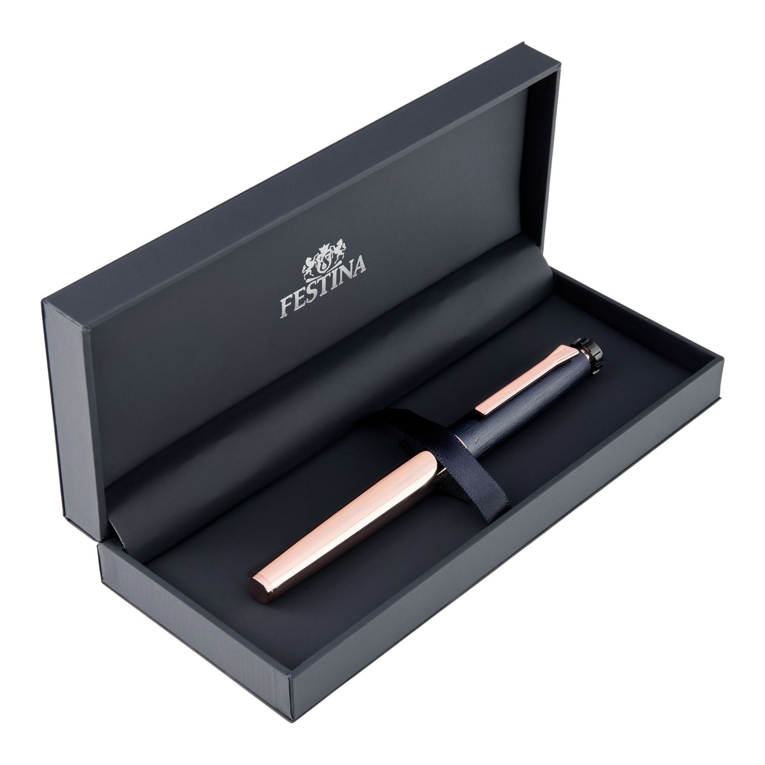 Pióro kulkowe Chronobike z granatową szczotkowaną skuwką i korpusem w kolorze różowego złota uosabia esencję nowoczesności i aerodynamiki kolekcji. Jego smukły, owalny kształt przywołuje na myśl ruch i elegancję, a różowo-złote akcenty podkreślają jego wyrafinowany design. Charakterystyczne detale, takie jak górna część inspirowana przyciskiem zatrzymania zegarka Chronobike i odważny Festina Blason, podkreślają jego charakterystyczny kunszt. Uzupełnione o charakterystyczny dla linii klips, to pióro płynnie łączy styl i funkcjonalność, pokazując zaangażowanie Festiny w precyzję i skrupulatną dbałość o szczegóły.