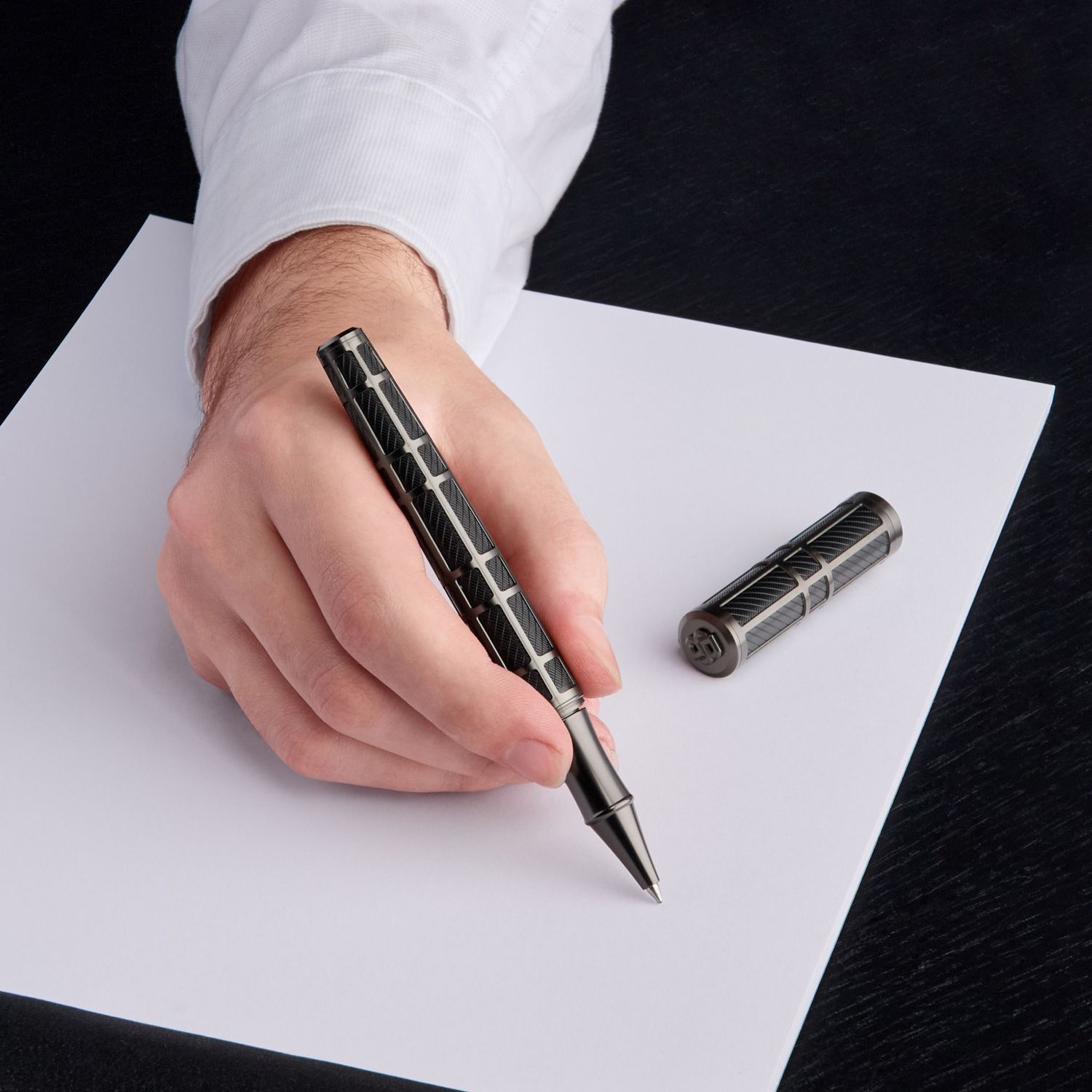 Ten dobrze wyważony, a jednocześnie solidny kształt posiada zewnętrzną siatkę inspirowaną architekturą Bauhaus, nadając geometryczny i strukturalny charakter temu wyraźnie nowoczesnemu elementowi. Siatka nakłada się na grawerowaną powierzchnię, tworząc subtelny kontrast kolorów i faktur. Eleganckie zwieńczenie stanowi nowe trójwymiarowe logo Double B.