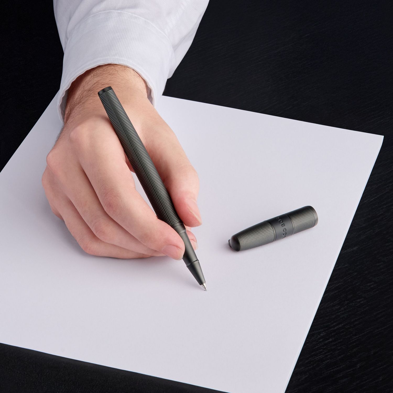 Elevate your writing experience with the HUGO BOSS Rollerball Pen in sleek Grid Black. Crafted from premium brass with a striking black plating, this luxurious pen combines sophistication and functionality, weighing just 41 grams for effortless handling. Its smooth black ink glides effortlessly, making every word a statement. Perfect for professionals and style enthusiasts alike, it’s suitable for everyone—man, woman, or unisex. Whether signing important documents or jotting down ideas, the HUGO BOSS Rollerball Pen is the ultimate accessory that defines elegance. Make every moment unforgettable.