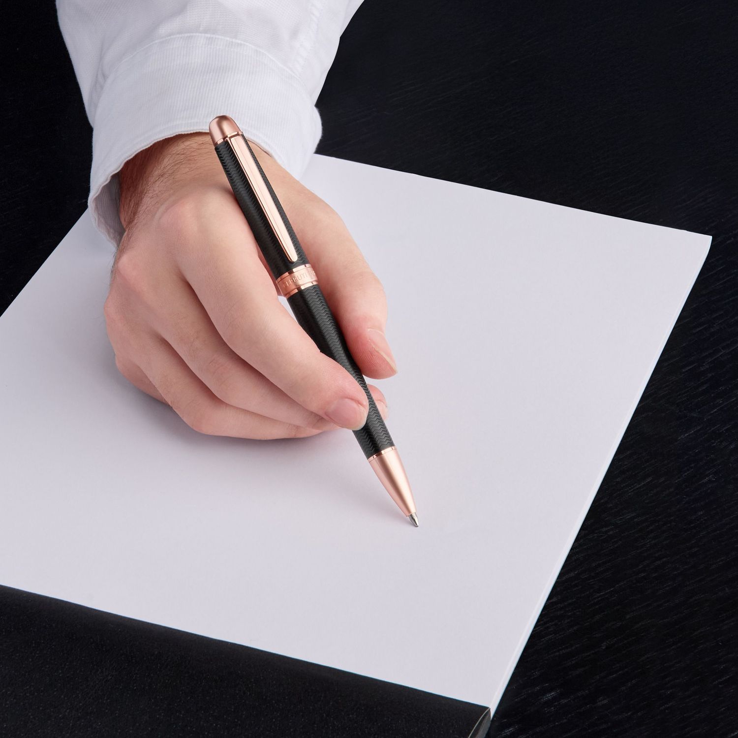 Klasyczny kształt, ozdobiony szewronowym grawerem na powierzchni, odzwierciedlającym tekstylny nadruk tytułowej linii toreb, łączy ponadczasowy styl z nowoczesnym luksusem. Wykończenia i pierścień w kolorze różowego złota, grające matowymi i błyszczącymi kontrastami, wnoszą wyrafinowane ciepło do tego niedrogiego, wysokiej jakości instrumentu piśmiennego.
