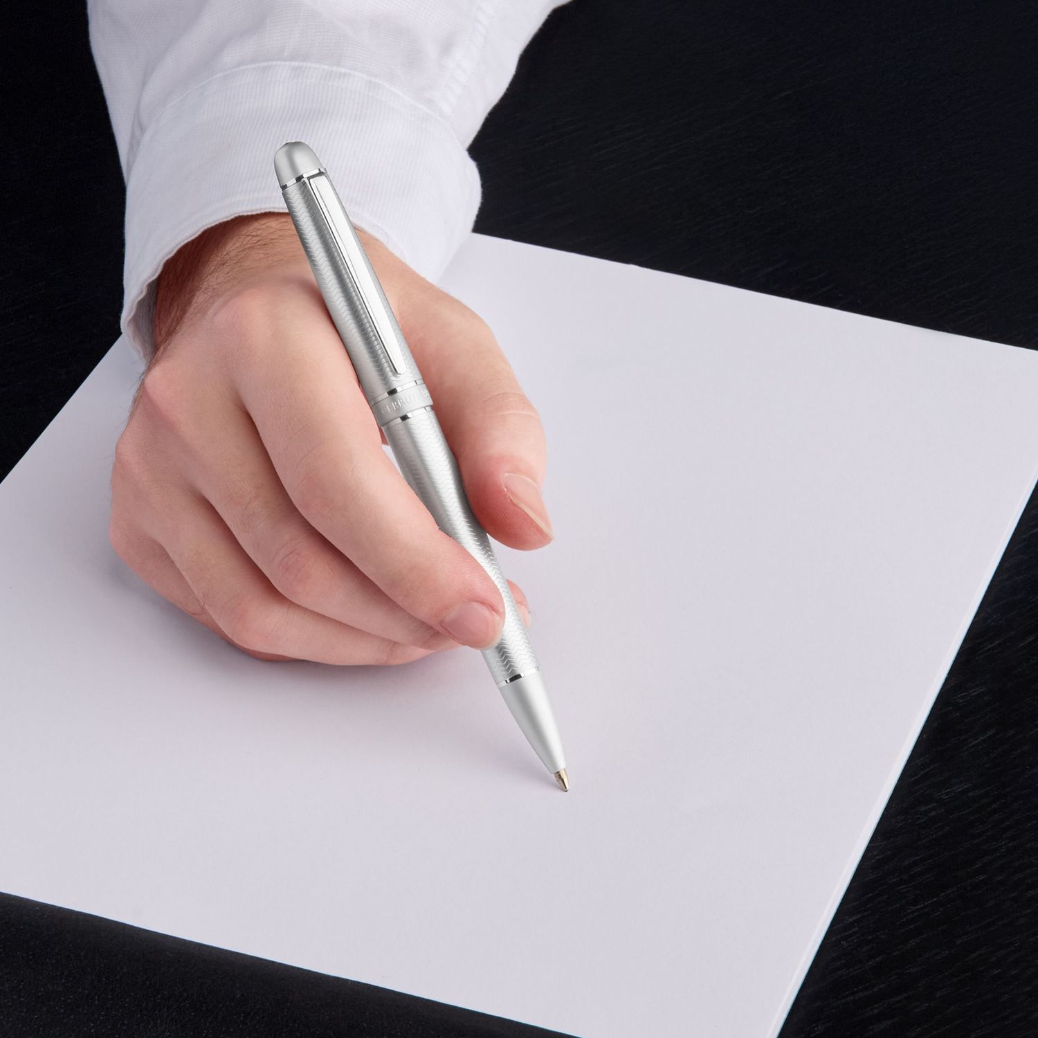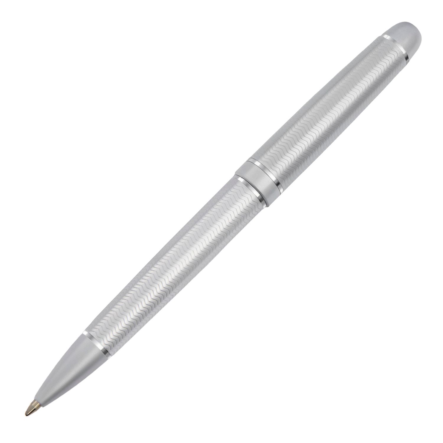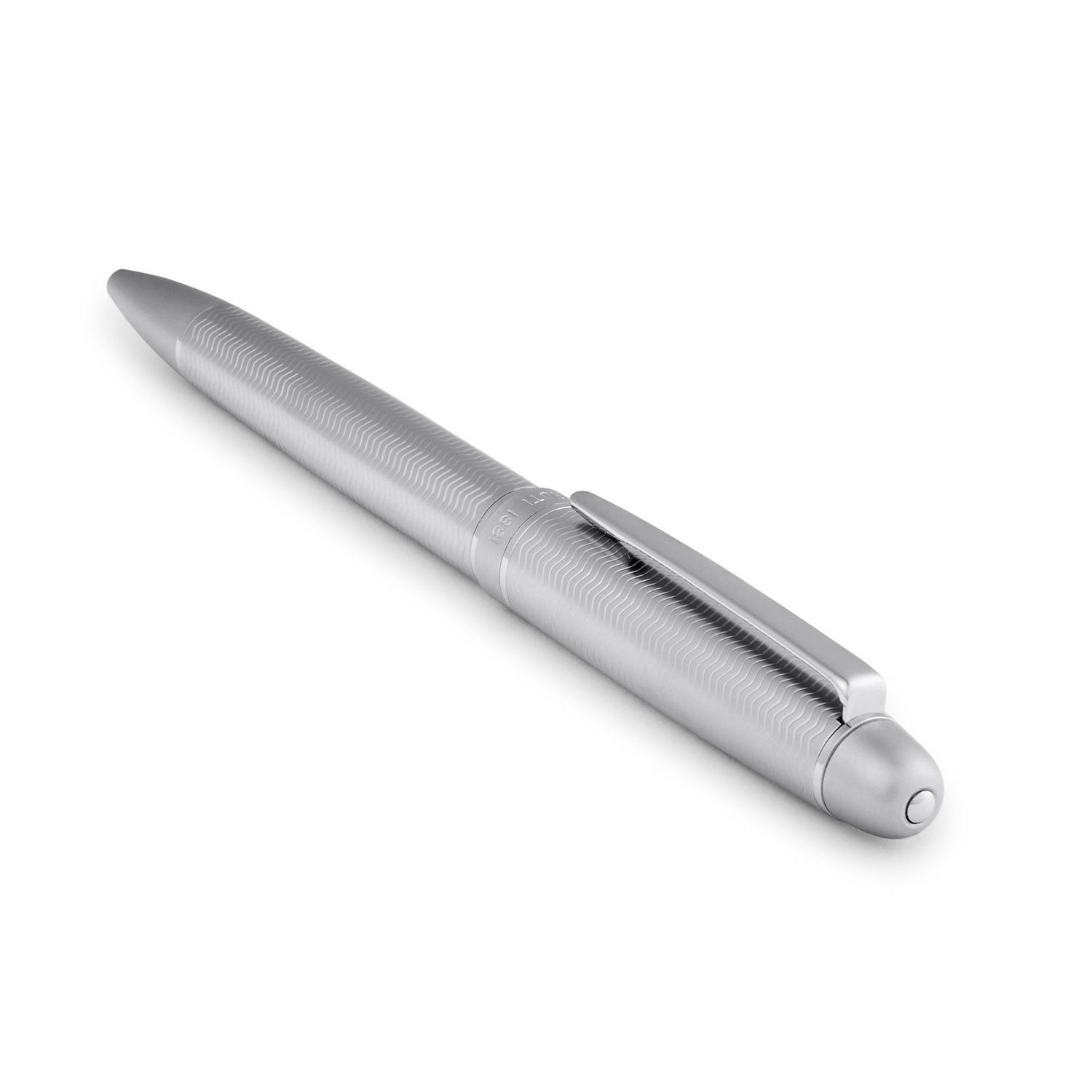 Klasyczny kształt, ozdobiony szewronowym grawerem na powierzchni, odzwierciedlającym tekstylny nadruk tytułowej linii toreb, ten całkowicie srebrny długopis emanuje ponadczasowym urokiem. Gra matowych i błyszczących srebrnych wykończeń na środkowym pierścieniu podkreśla jego wyrafinowaną estetykę, czyniąc go wyrafinowanym i niedrogim wyborem.
