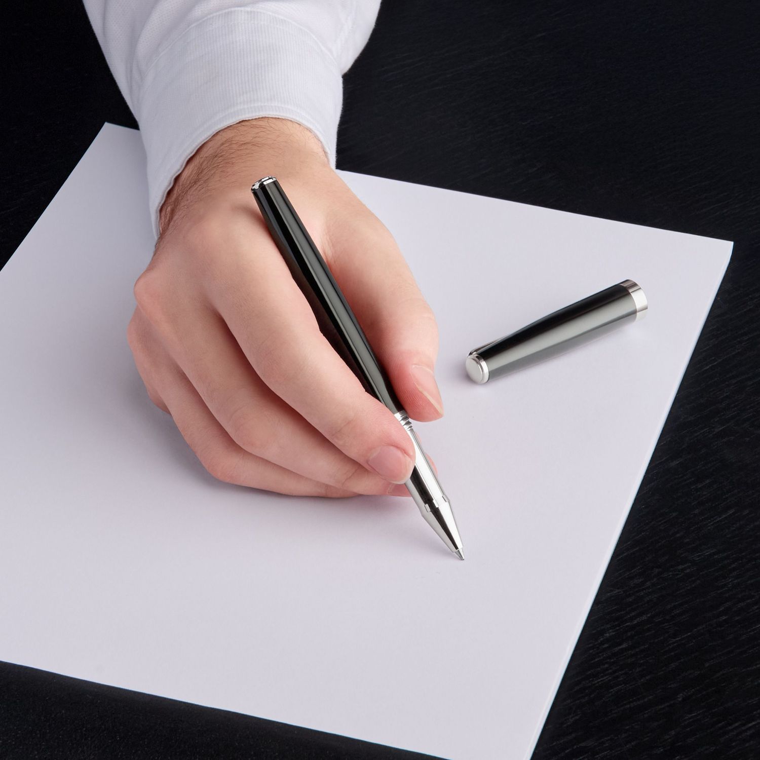 Należące do nowej serii Cerruti 1881 Islington pióro kulkowe oferuje harmonijną równowagę formy i funkcji. Czarne matowe wykończenie i chromowane wykończenia tworzą wyrafinowany wygląd, a zakręcana skuwka i logo CRR na klipsie podkreślają jego luksusowy wygląd, czyniąc go ponadczasowym wyborem dla wymagających pisarzy.
